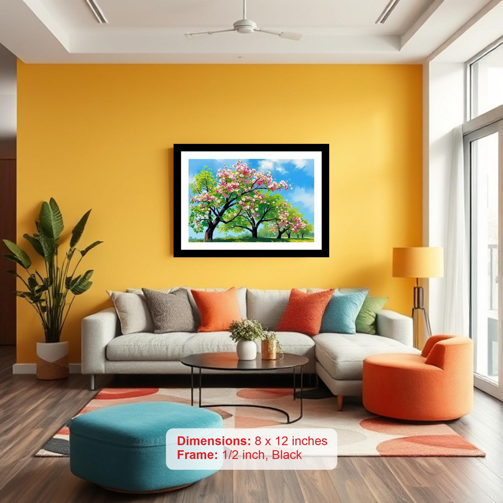 Bring the vibrant beauty of spring into your home with this elegantly framed, museum-quality digital reprint. Featuring a stunning portrait of pink flowers bursting into life amidst a blossoming landscape, this artwork captures the essence of the season. Delicate cherry blossoms and apple blossoms paint a picturesque scene under a sunny, radiant sky. The artwork is a testament to the enduring appeal of floral art and nature paintings, evoking feelings of peace, renewal, and joy. The classic black frame adds a touch of sophistication, making it a versatile piece that complements any decor. This piece is perfect for adding a splash of color and warmth to your living room, bedroom, or office. The vibrant colors and intricate details of the original painting are faithfully reproduced, ensuring a long-lasting and visually captivating addition to your art collection. This framed print is a beautiful way to celebrate the arrival of spring year-round.