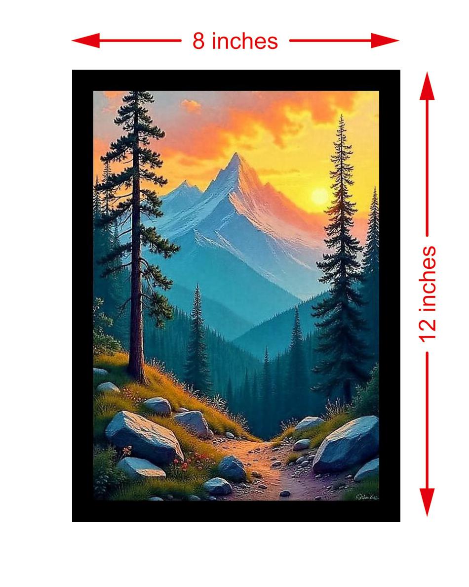 A stunning landscape artwork beautifully captures nature's serene beauty with vibrant sunset hues, majestic mountains, and lush forests. Colors pop, detail is crisp, and the portrait's beauty shines through. A true masterpiece revived. The digital reprint boasts striking composition, breathing new life into the portrait's inherent beauty. Versatile Decor: Ideal for enhancing the aesthetic appeal of living rooms and bedrooms Enhanced Durability: Weather-shield laminated digital print for lasting vibrancy and protection Premium Framing: Constructed with a high-quality, durable fiber frame for long-term stability Precise Dimensions: 30 cm x 20 cm x 1 cm