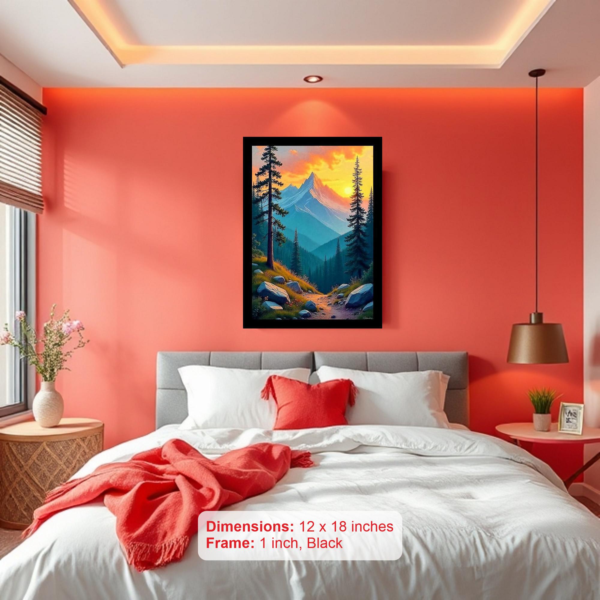 Immerse yourself in the serene beauty of nature with this stunning, classic black-framed digital reprint. This elegant piece captures a breathtaking mountain landscape at sunset, a timeless scene that will bring tranquility and sophistication to any room. Towering pine trees stand majestically against the vibrant sky, their silhouettes adding depth and drama to the composition. A lush forest blankets the foothills, hinting at the hidden wonders within. Weathered rocks and a winding path invite the viewer to embark on an imaginary journey through this picturesque wilderness. The warm hues of the setting sun paint the sky with fiery oranges, soft pinks, and gentle purples, creating a captivating display of natural artistry. This print is meticulously crafted to preserve the original artwork's detail and color fidelity, ensuring a high-quality reproduction that will last for years to come. The classic black frame adds a touch of sophistication, making it a versatile addition to any decor, whether modern, traditional, or rustic. This framed print is more than just a decorative piece; it's a window to a peaceful world, a reminder of the enduring power and beauty of nature. Perfect for living rooms, bedrooms, offices, or hallways, this landscape print will transform your space into a calming oasis. Bring the majestic beauty of the mountains, the serenity of the forest, and the vibrant colors of the sunset into your home with this exquisite framed artwork.