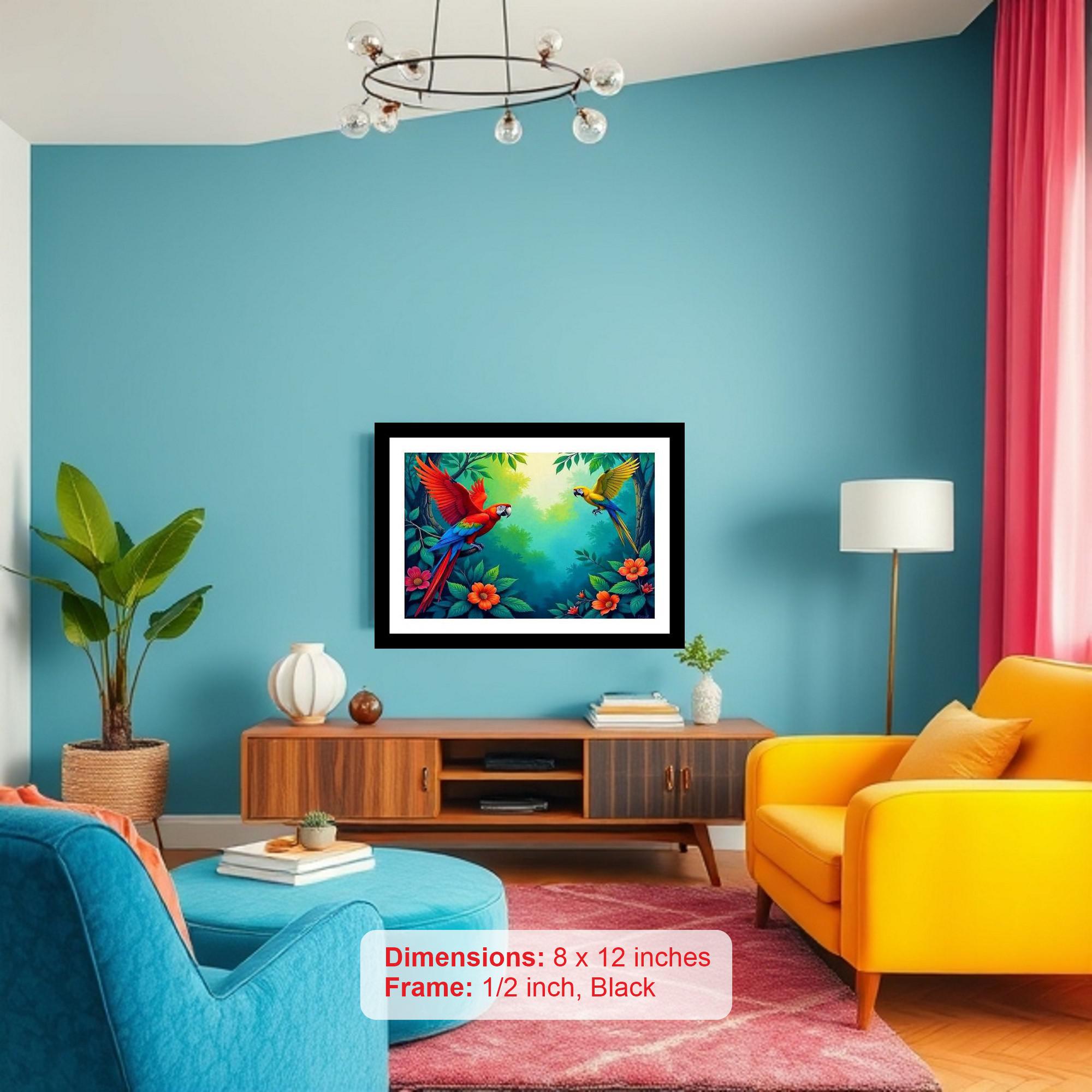 Elevate your home decor with this exquisite digital reprint of a captivating parrot portrait, beautifully presented in a classic black frame. This elegant artwork depicts two vibrant parrots nestled amidst a serene jungle setting, bringing a touch of tropical charm and natural beauty to any room. The rich colors of the parrots feathers contrast perfectly with the lush greenery of the jungle backdrop, creating a visually stunning piece that will capture attention and spark conversation. The high-quality digital reprint ensures exceptional clarity and detail, faithfully reproducing the original artwork with remarkable precision. The classic black frame adds a touch of sophistication and provides a timeless aesthetic that complements a wide range of interior styles, from traditional to modern. Whether you're looking to add a splash of color to your living room, create a relaxing atmosphere in your bedroom, or enhance the ambiance of your office, this framed parrot portrait is the perfect choice. Its vibrant colors and captivating composition will instantly transform any space into a haven of tranquility and beauty. This piece is ready to hang and enjoy, making it a hassle-free addition to your art collection.