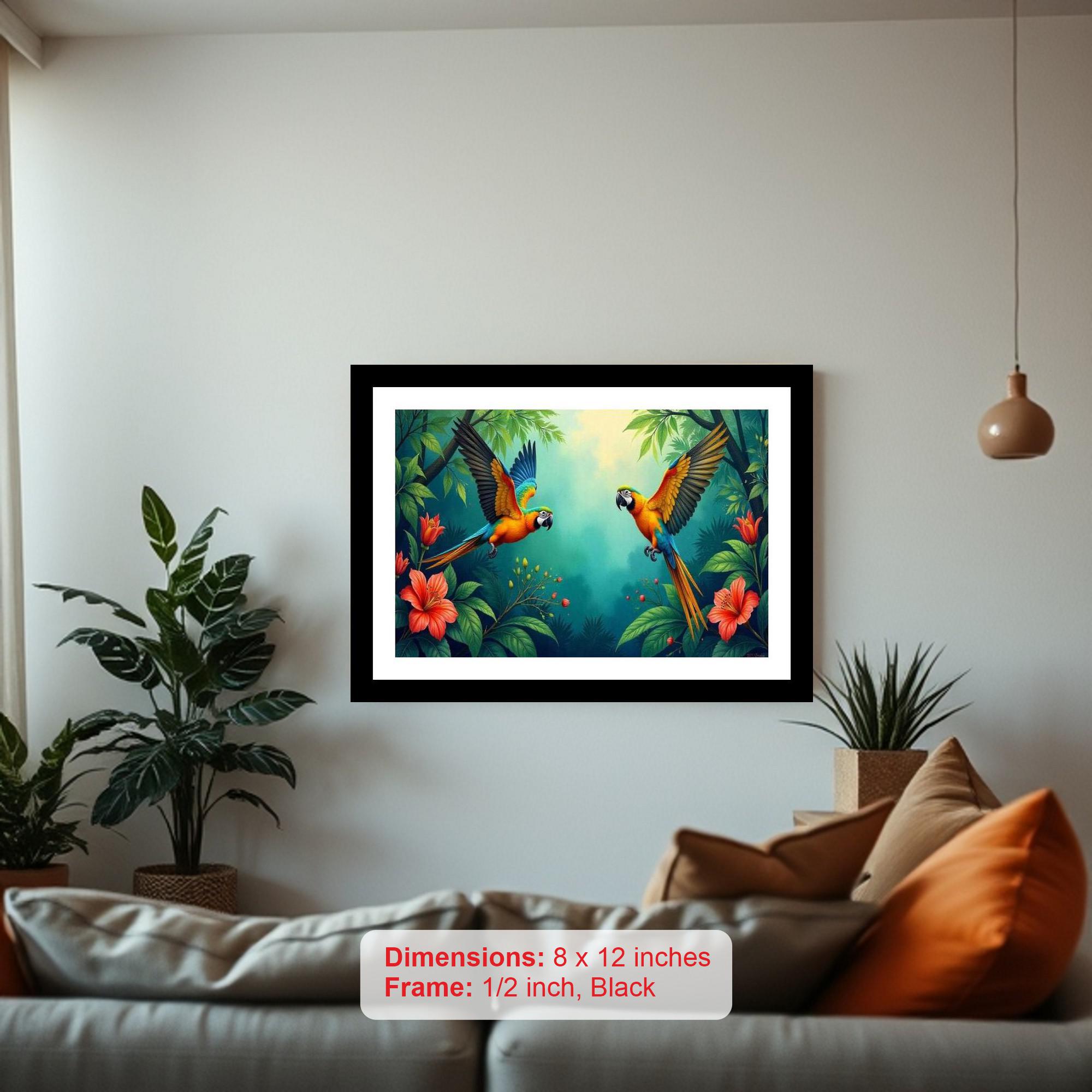 Vibrant parrots pop against a tranquil jungle, a stunning celebration of color and serenity! The reprint's vibrant colors and crisp details beautifully capture the portrait's original charm. The digital reprint boasts a striking composition, beautifully capturing the portrait's essence with stunning clarity. Versatile Decor: Ideal for enhancing the aesthetic appeal of living rooms and bedrooms Enhanced Durability: Weather-shield laminated digital print for lasting vibrancy and protection Premium Framing: Constructed with a high-quality, durable fiber frame for long-term stability Precise Dimensions: 30 cm x 20 cm x 1 cm