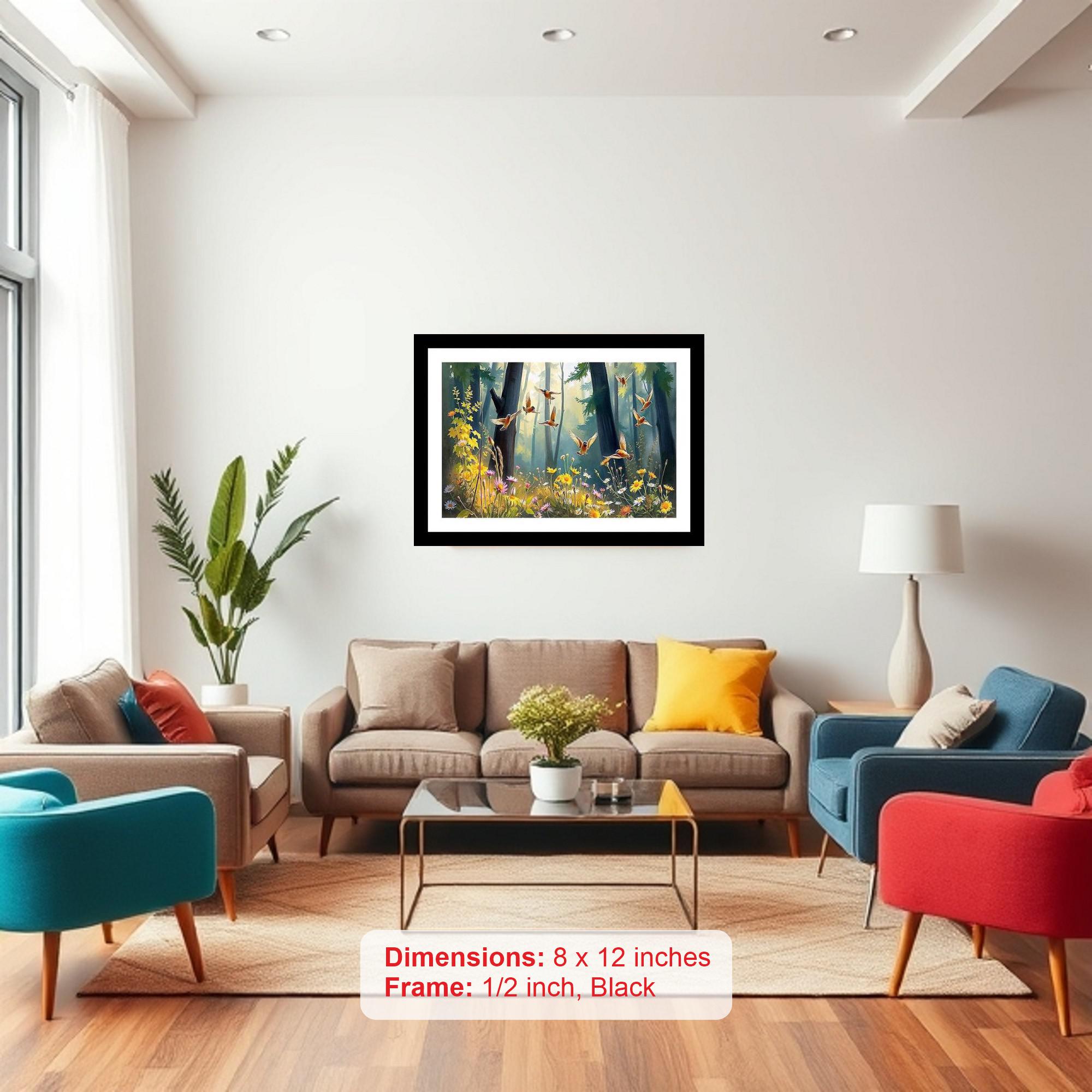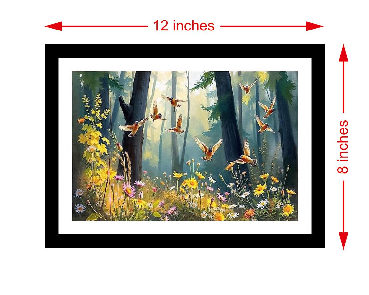 Transform your living space into a serene sanctuary with our exquisitely crafted digital reprint of a timeless portrait. This stunning canvas print captures a majestic view of a lush green forest, its verdant depths teeming with life and tranquility. Imagine the dappled sunlight filtering through the canopy, illuminating the vibrant undergrowth and creating an atmosphere of peaceful escape. Adding to the enchantment, beautiful birds flutter and dance amongst the branches, their colorful plumage a delightful contrast to the surrounding greenery. Scattered throughout the scene are splashes of vibrant yellow flowers, adding pops of sunshine and joy to the composition. The entire artwork is encased in a classic black frame, lending an air of sophistication and elegance to any room. This piece is more than just a decoration; it's an invitation to immerse yourself in the beauty of nature and find solace in its calming embrace. Perfect for your living room, bedroom, office, or hallway, this framed canvas print is a versatile addition to any decor style. It also makes a thoughtful and cherished gift for nature lovers, art enthusiasts, or anyone seeking a touch of serenity in their lives. Bring the beauty of the outdoors in with this timeless and captivating work of art.