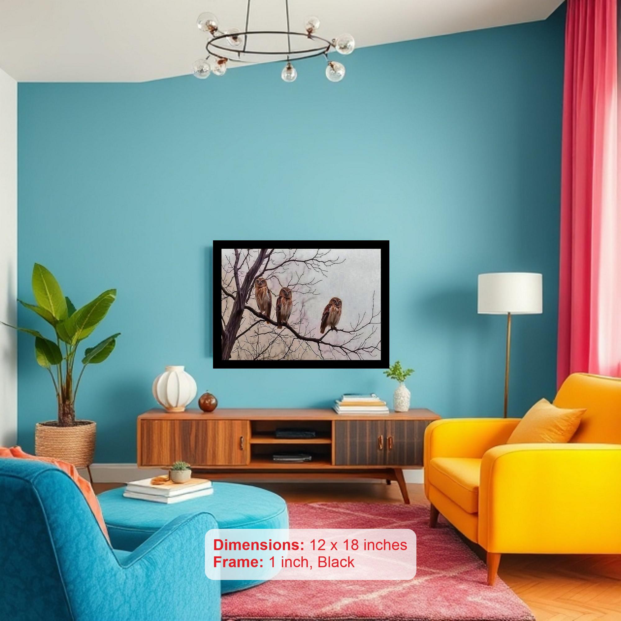 Adorn your home with a touch of timeless elegance with this exquisite digital reprint of a classic portrait, beautifully framed in classic black. The artwork depicts three majestic owls perched gracefully on bare branches, the starkness of the leafless trees hinting at the quiet beauty of the late autumn or early winter season. The owls, rendered with remarkable detail and lifelike precision, exude an air of wisdom and serenity. The subtle interplay of light and shadow highlights the texture of their feathers and the intricate patterns of the branches, creating a visually captivating scene that draws the viewer in. This piece adds a sophisticated and calming presence to any room, whether it's your living room, bedroom, office, or hallway. It is a perfect statement piece for lovers of nature, wildlife art, or anyone seeking to create a refined and peaceful atmosphere. The black frame complements the artwork perfectly, providing a clean and modern contrast that enhances its classic appeal. This is more than just a picture; it's a conversation starter, a focal point, and a testament to the enduring beauty of the natural world.