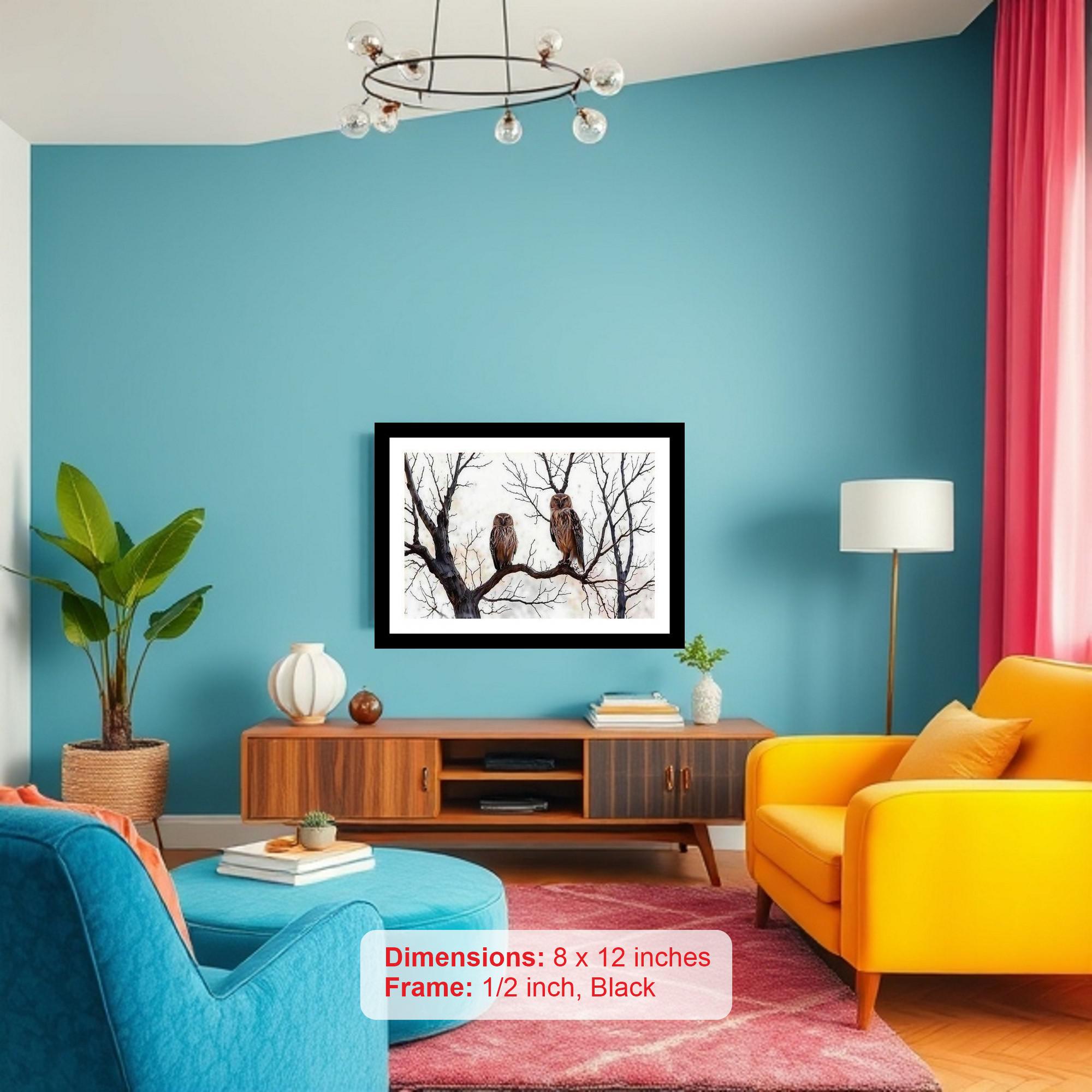 Adorn your living space with the timeless elegance of our "Autumnal Owls" framed print, a captivating digital reproduction showcasing two wise owls perched serenely side-by-side on a stark, yet beautiful, autumn branch. The scene is imbued with a quiet grace, the stark branches of the leafless tree hinting at the approaching winter, while the owls themselves exude a sense of calm observation. This artful representation captures the essence of nature's transition, blending the stark beauty of fall with the enigmatic allure of these nocturnal creatures. The print is meticulously crafted to highlight the intricate details of the original artwork, showcasing the texture of the owls' feathers, the weathered bark of the branch, and the subtle nuances of the fading light. Encased in a classic black frame, this piece seamlessly integrates into any decor, adding a touch of sophistication and rustic charm to your home or office. The high-quality digital printing ensures vibrant colors and lasting clarity, preserving the artwork's integrity for years to come. "Autumnal Owls" is more than just a decorative piece; it's a conversation starter, a window into the natural world, and a reminder of the quiet wisdom that surrounds us. Ideal for bird lovers, nature enthusiasts, or anyone seeking a touch of understated elegance, this framed print makes a thoughtful and lasting gift. Its versatile aesthetic complements a range of interior styles, from traditional to contemporary, effortlessly enhancing any room with its subtle charm and enduring appeal. The print arrives ready to hang, making it a hassle-free addition to your wall decor. Bring the serene beauty of the autumn woods into your home with "Autumnal Owls" and experience the timeless allure of nature's artistry.