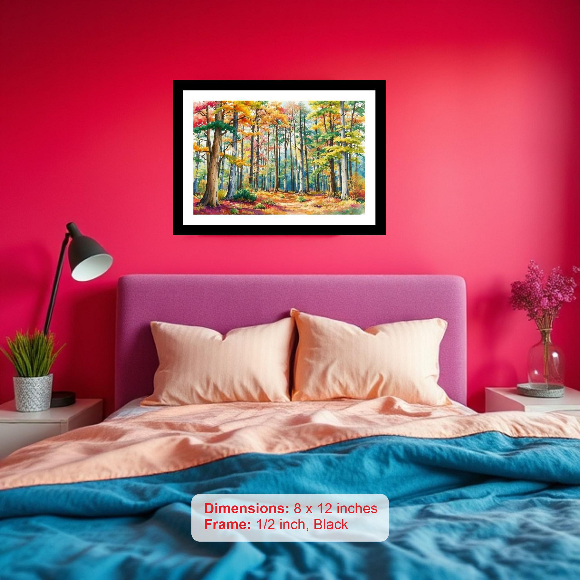 This stunning, digitally reprinted portrait, elegantly framed in classic black, transports you to the heart of a vibrant autumn forest. Imagine a sunlit path meandering through a breathtaking landscape where trees are ablaze with a symphony of fall colors - fiery reds, warm oranges, and golden yellows all shimmering under the gentle caress of the sun. The artist masterfully captures the crispness of the autumn air and the serene beauty of nature in its seasonal splendor. This piece brings a touch of sophisticated warmth and tranquility to any room. It's perfect for adding a focal point to your living room, bedroom, or office, instantly enhancing your decor with its timeless appeal. The high-quality digital reprint ensures crisp details and rich color fidelity, allowing you to appreciate every brushstroke and subtle nuance as if it were an original painting. The classic black frame complements the artwork beautifully, providing a clean and modern aesthetic that blends seamlessly with any style. This captivating artwork evokes a sense of peace and wonder, making it a cherished addition to your home or a thoughtful gift for art lovers and nature enthusiasts alike. Experience the beauty of autumn every day with this exquisite piece that captures the essence of the season's magic.