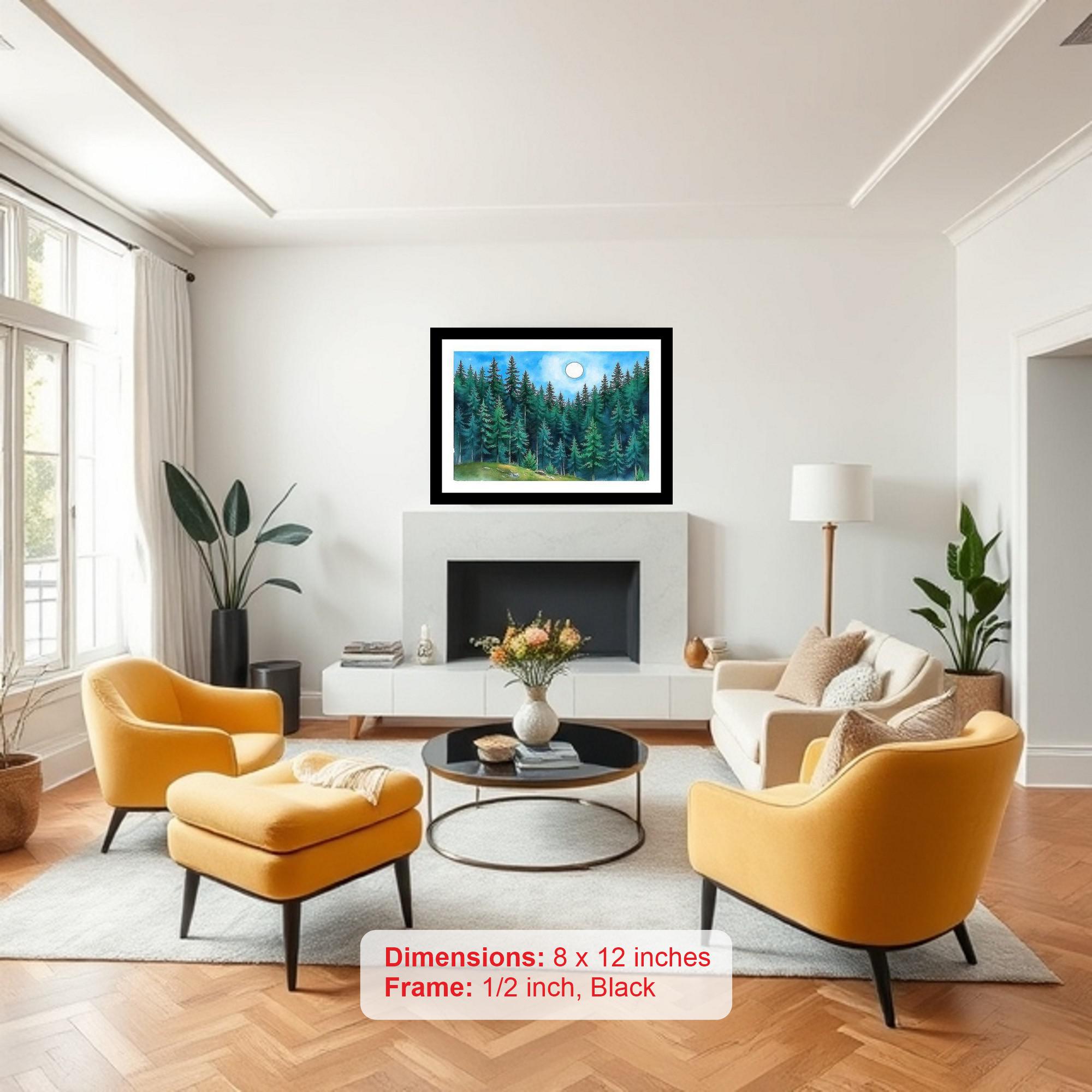 Immerse yourself in the tranquil beauty of nature with our exquisitely crafted, digitally reprinted portrait, "Moonlit Evergreens." This captivating artwork depicts a serene evergreen forest bathed in the ethereal glow of the moon, evoking a sense of peace and tranquility that will transform any living space. The scene is rendered with remarkable detail, capturing the subtle textures of the evergreen needles, the intricate patterns of moonlight filtering through the branches, and the deep, inviting shadows that dance across the forest floor. The cool, silvery light of the moon creates a soothing and calming atmosphere, making this piece perfect for bedrooms, living rooms, offices, or any space where you seek a touch of serenity. Encased in a classic black frame, this artwork exudes elegance and sophistication, seamlessly blending with a variety of interior design styles, from modern minimalist to traditional and rustic. The frame's clean lines and timeless design enhance the artwork's inherent beauty without overpowering it, ensuring that the focus remains on the breathtaking scene within. Printed using advanced digital reproduction techniques, this artwork boasts exceptional clarity, color accuracy, and longevity. The high-quality materials used in its production ensure that the image remains vibrant and fade-resistant for years to come, allowing you to enjoy its beauty and tranquility for a lifetime. "Moonlit Evergreens" is more than just a piece of art; it's an invitation to escape the hustle and bustle of daily life and reconnect with the calming power of nature. It's a perfect gift for nature lovers, art enthusiasts, or anyone who appreciates the beauty and tranquility of the natural world. Bring the serenity of a moonlit forest into your home with this stunning digital reprint and create a haven of peace and tranquility that you can enjoy every day.