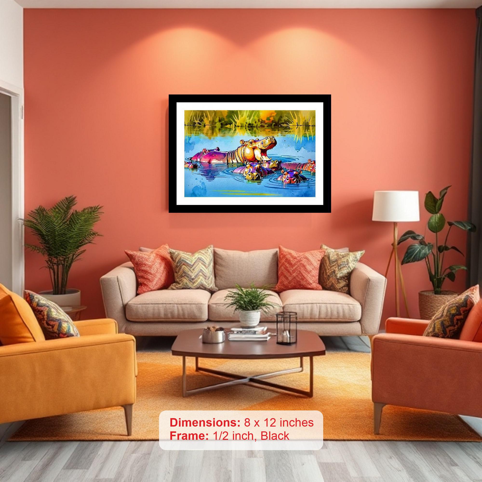 Bring the playful spirit of the African savanna into your home with this elegantly framed digital reprint of a charming portrait. Depicting a vibrant family of hippos luxuriating in the cool embrace of a sun-drenched watering hole, this artwork captures the beauty and tranquility of wildlife in its natural habitat. The scene unfolds with a rich tapestry of colors, from the warm golden hues of the sunlight reflecting off the water to the earthy tones of the hippos themselves, creating a visually captivating and heartwarming image. The classic black frame adds a touch of sophistication, making it a versatile piece that complements a variety of interior styles, from modern minimalist to traditional decor. This print is more than just a decoration; it's a conversation starter, a window to a world of wonder, and a reminder of the importance of preserving our planet's incredible biodiversity. Perfect for living rooms, bedrooms, offices, or children's spaces, this framed print brings a touch of nature's serenity and a sense of joyful exuberance to any room.