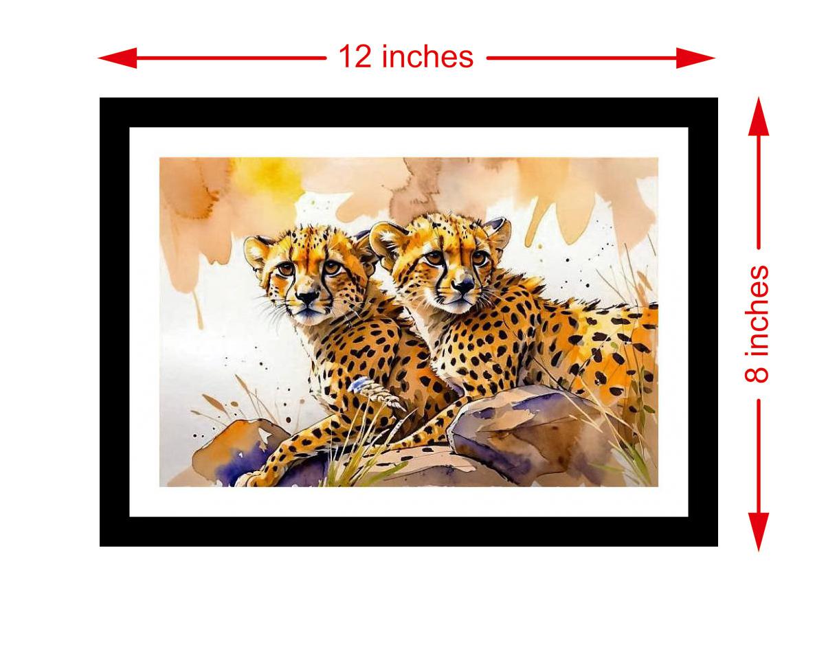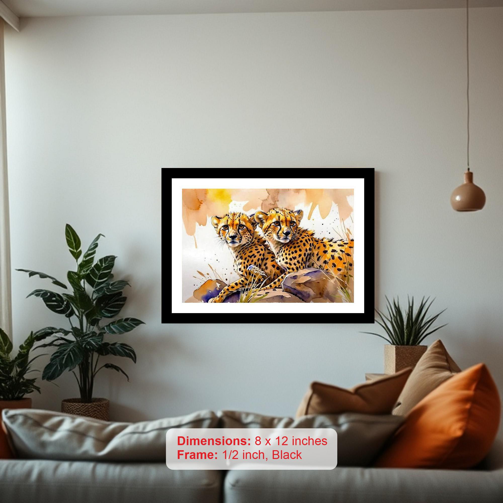 Bring the beauty of the African savanna into your home with this captivating digital reprint of a charming portrait. This elegant piece features two adorable cheetah cubs snuggled together on sun-warmed rocks, bathed in the soft, golden light of the setting sun. The classic black frame adds a touch of sophistication, making it a perfect addition to any living room, bedroom, or office. The image captures the tender bond between siblings and the inherent grace of these magnificent creatures, creating a heartwarming and visually stunning focal point. This high-quality reprint is designed to last, ensuring that you can enjoy this timeless scene for years to come. It's an ideal gift for animal lovers, wildlife enthusiasts, or anyone who appreciates beautiful art. Add a touch of wild elegance and serene beauty to your space with this exquisite framed print.