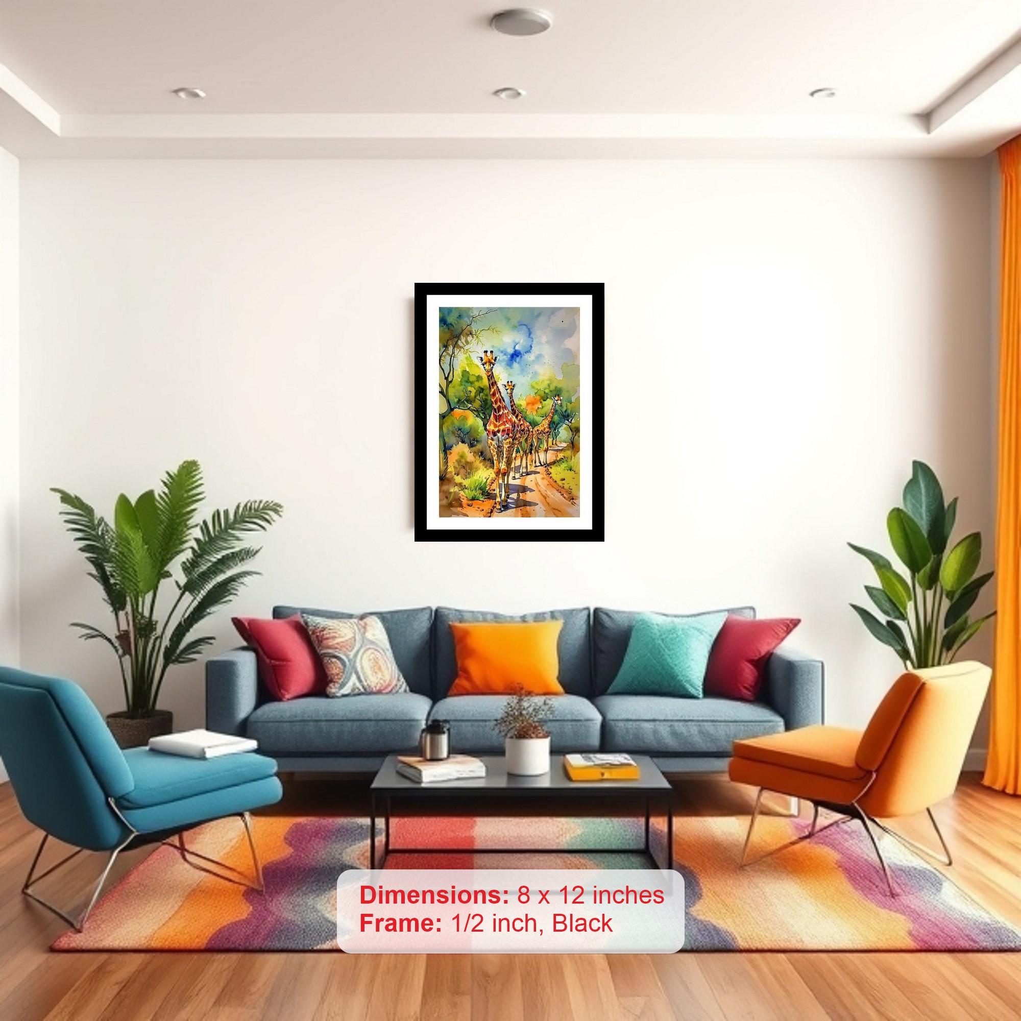 Bring the serene beauty of the African savanna into your home with this elegant digital reprint featuring three giraffes gracefully strolling down a sun-drenched path. Encased in a classic black frame, this piece adds a touch of sophisticated wanderlust to any room. The high-quality reprint captures the warmth of the African sun and the gentle nature of these majestic creatures, creating a calming and visually appealing focal point for your living room, bedroom, office, or hallway. The neutral tones and timeless subject matter ensure it complements a wide range of interior design styles, from minimalist and modern to traditional and bohemian. Let this captivating artwork transport you to the heart of Africa and infuse your space with a sense of tranquility and adventure.