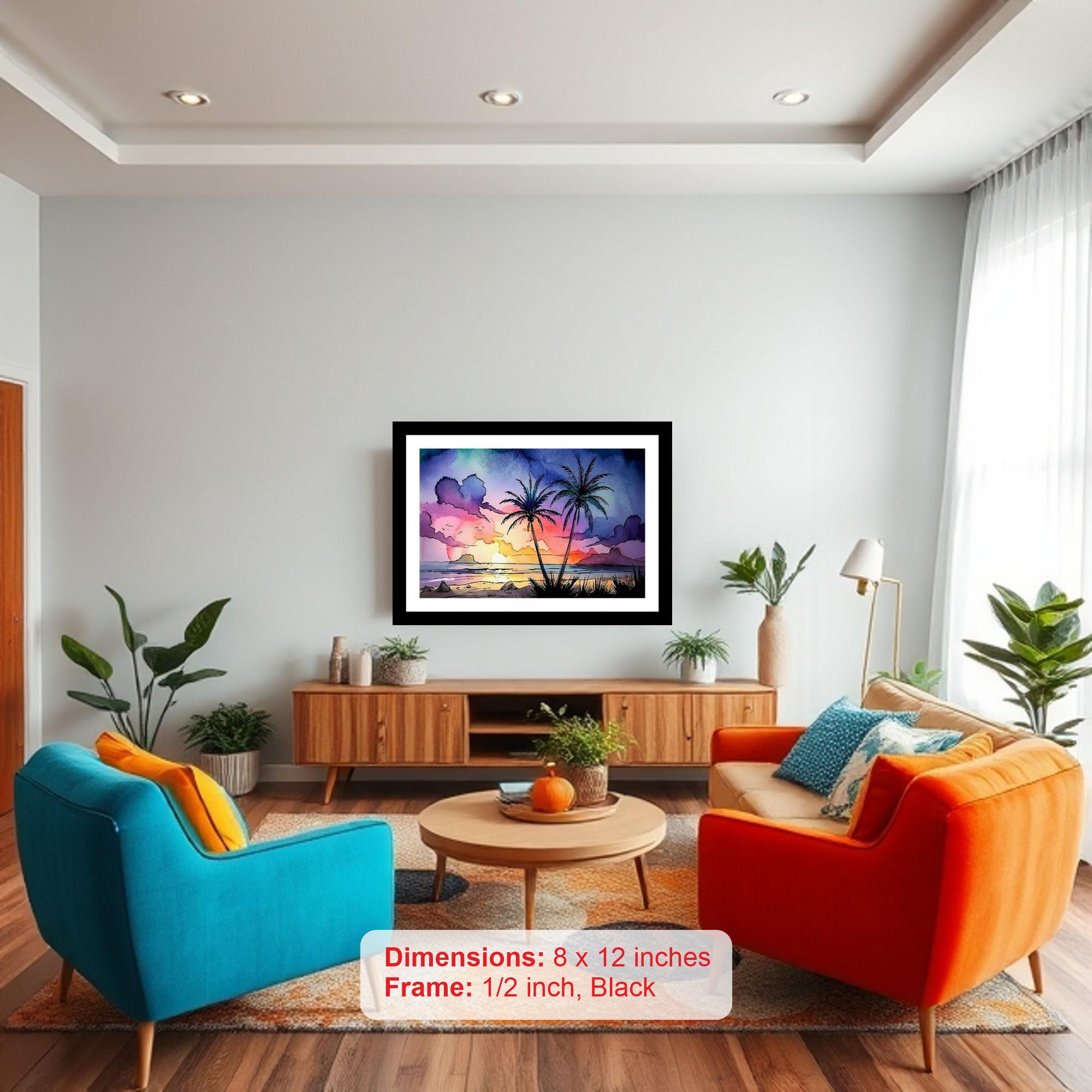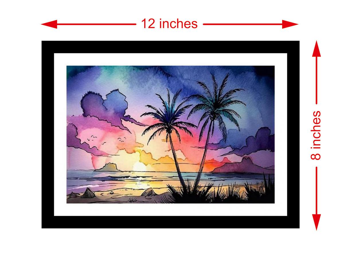 A vibrant sunset bathes a tranquil beach and silhouetted palms in breathtaking color. The reprint's vibrant colors and crisp details truly capture the portrait's original beauty. The reprint's composition is stunning! The artist's original vision shines through with impressive clarity. Versatile Decor: Ideal for enhancing the aesthetic appeal of living rooms and bedrooms Enhanced Durability: Weather-shield laminated digital print for lasting vibrancy and protection Premium Framing: Constructed with a high-quality, durable fiber frame for long-term stability Precise Dimensions: 30 cm x 20 cm x 1 cm