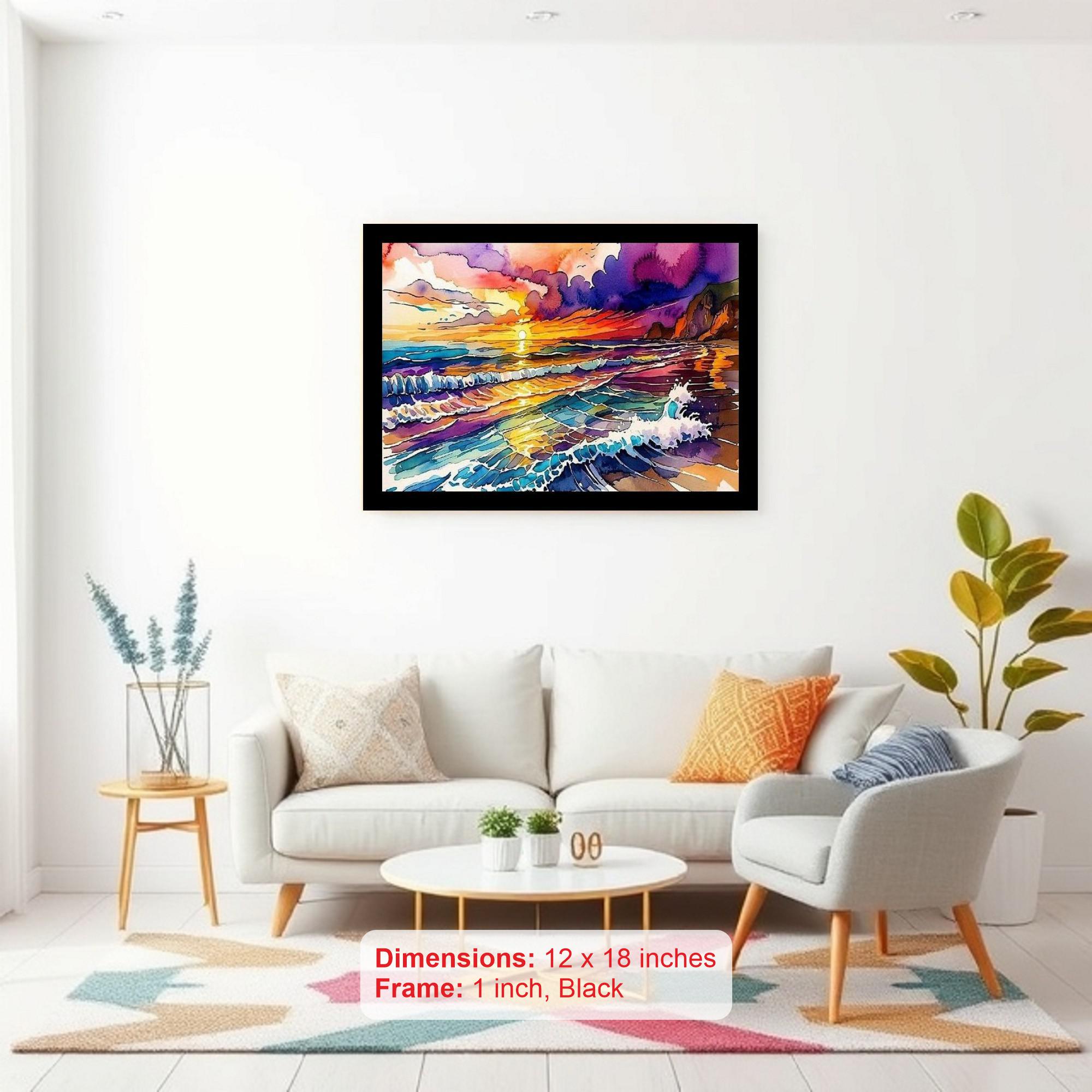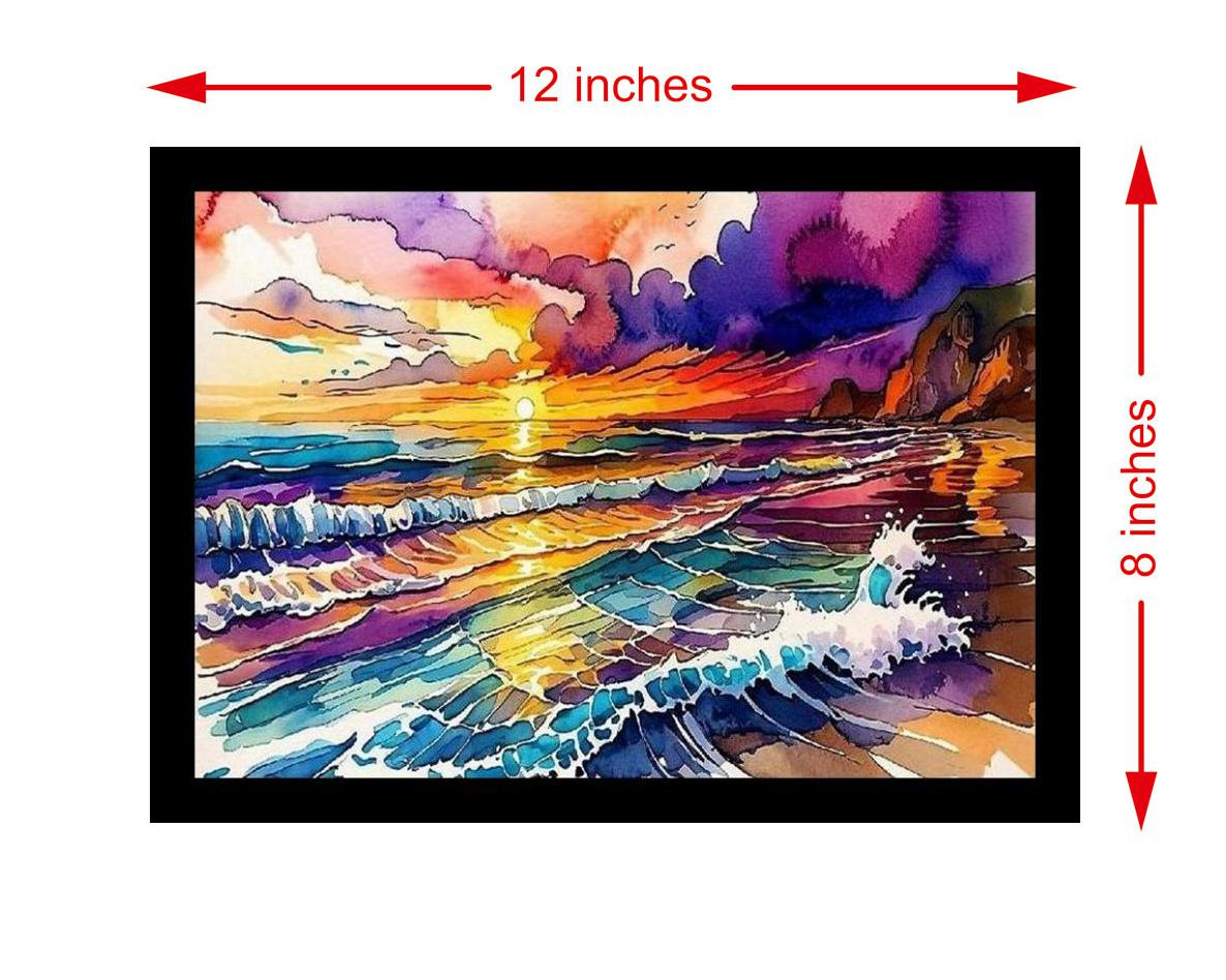 A vibrant sunset's colorful strokes transform ocean waves into a breathtaking masterpiece. The colors are vibrant and true, and the print captures every detail of the beautiful portrait. The digital reprint captures the portrait's beauty with striking composition; a truly masterful restoration. Versatile Decor: Ideal for enhancing the aesthetic appeal of living rooms and bedrooms Enhanced Durability: Weather-shield laminated digital print for lasting vibrancy and protection Premium Framing: Constructed with a high-quality, durable fiber frame for long-term stability Precise Dimensions: 30 cm x 20 cm x 1 cm