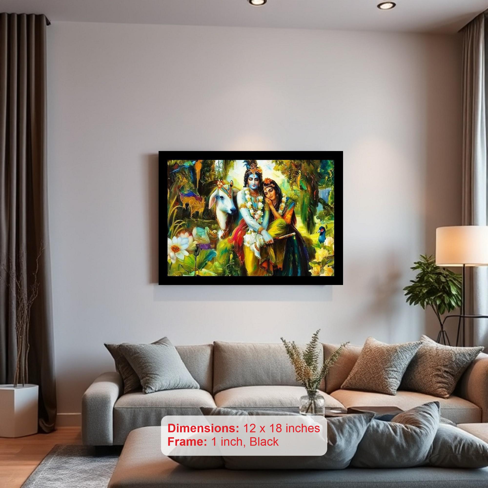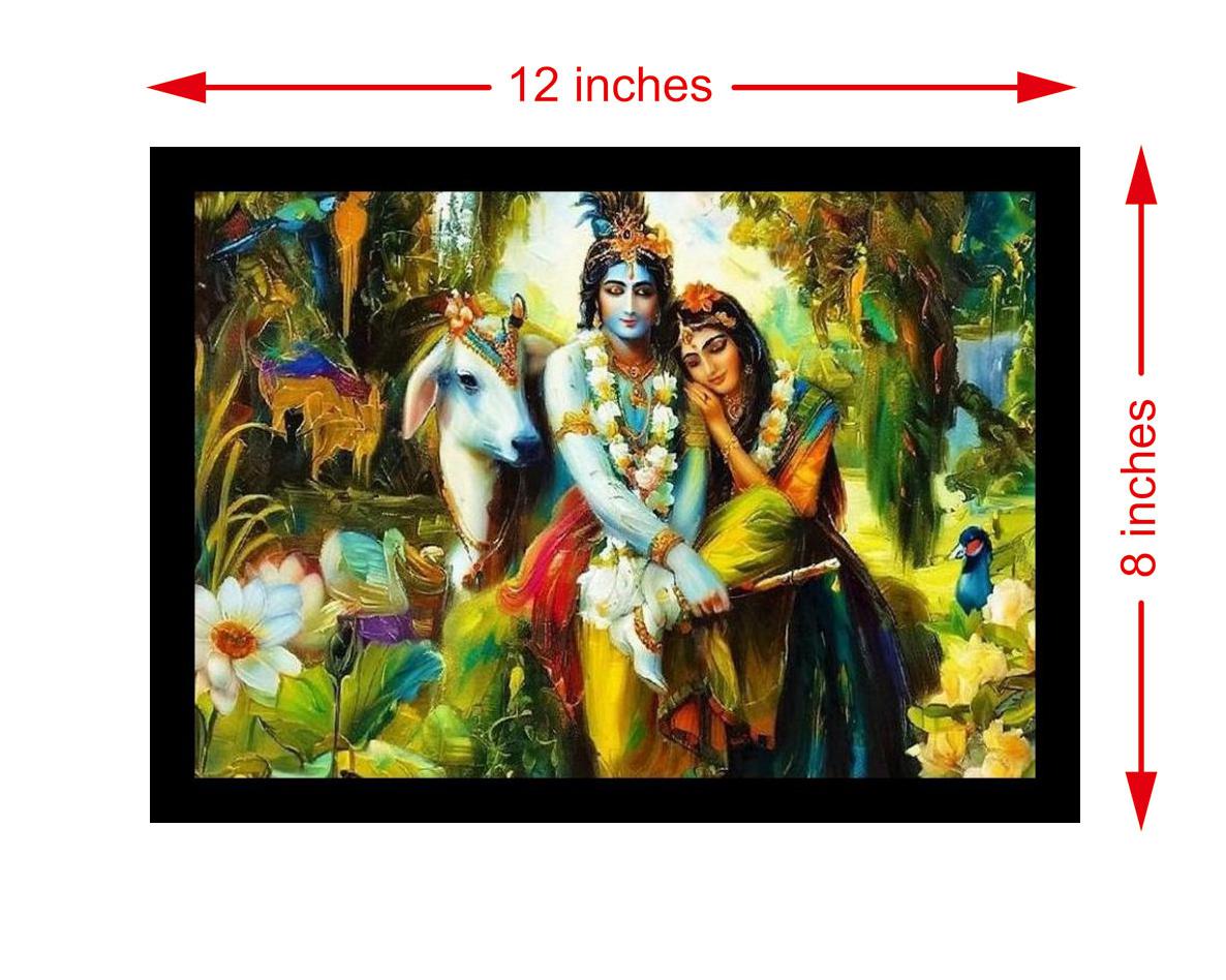A divine embrace: Krishna and Radha, a vibrant testament to eternal love in a lush, paradisiacal world. The colors are vibrant and true, the print detail is so crisp, it feels like the original. The digital reprint boasts a strikingly beautiful composition, breathing new life into the portrait's timeless grace. Versatile Decor: Ideal for enhancing the aesthetic appeal of living rooms and bedrooms Enhanced Durability: Weather-shield laminated digital print for lasting vibrancy and protection Premium Framing: Constructed with a high-quality, durable fiber frame for long-term stability Precise Dimensions: 30 cm x 20 cm x 1 cm