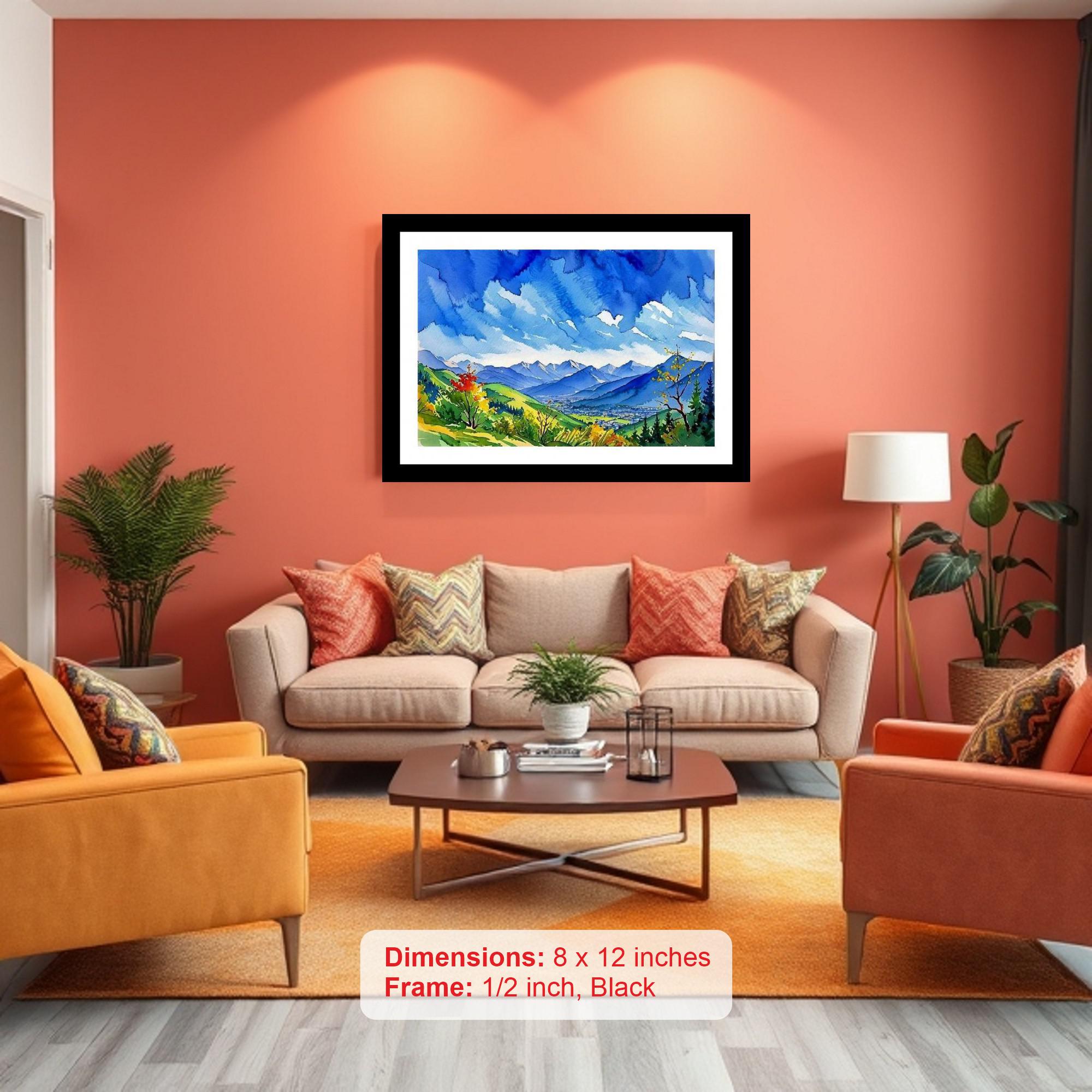 Transform your living space with this exquisite classic black-framed digital reprint of a captivating landscape. The artwork depicts a hillside ablaze with vibrant autumn colors, a breathtaking panorama of fiery reds, oranges, and yellows that evoke the warmth and beauty of the season. Nestled below the colorful hillside, a tranquil valley lies peacefully between majestic mountains, their imposing presence adding depth and grandeur to the scene. Above, a dramatic blue sky provides a stunning backdrop, its shifting hues and cloud formations creating a sense of vastness and wonder. The black frame enhances the artwork's vintage charm and elegance, adding a touch of sophistication to any room. This stunning reprint is perfect for adding a touch of classic beauty and autumnal warmth to your home decor. Its rich colors and detailed composition are sure to captivate viewers and create a focal point in any space, bringing the serenity and majesty of the natural world indoors.