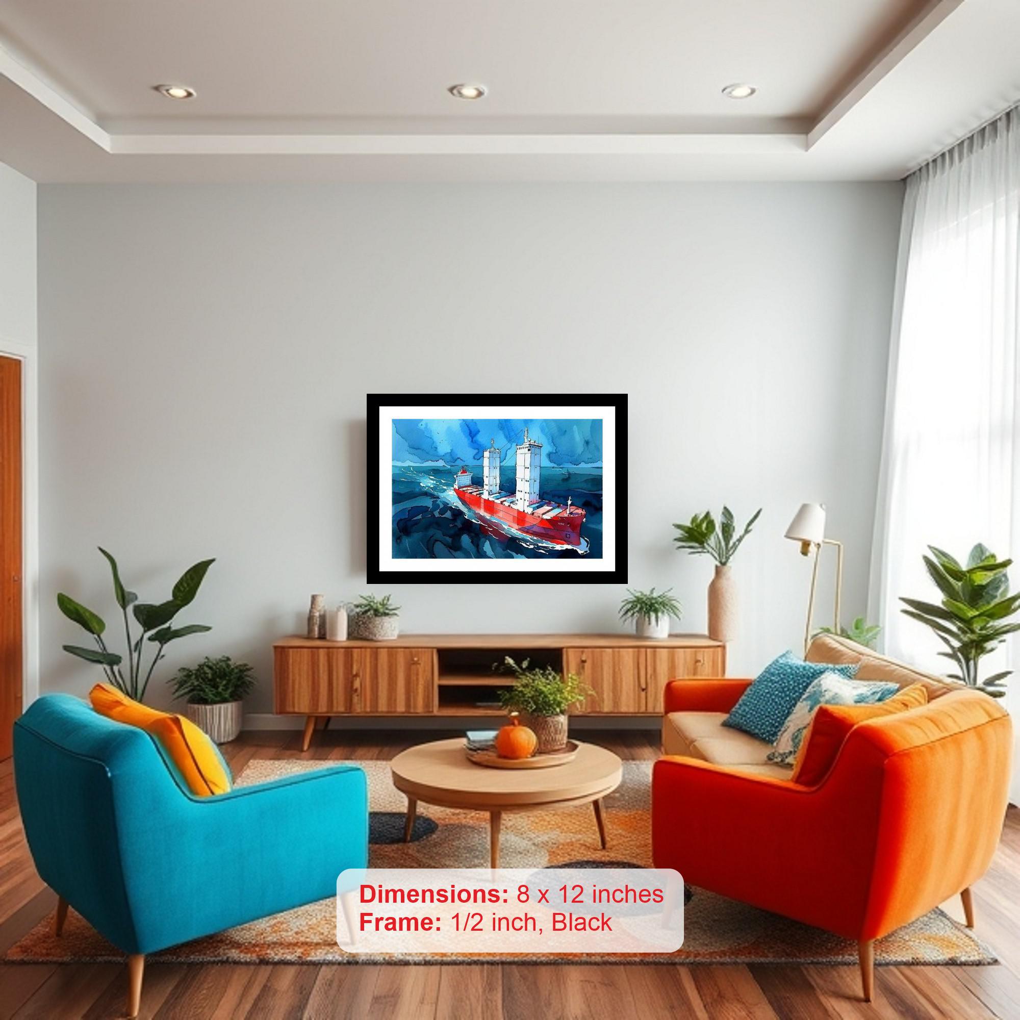 Immerse yourself in the captivating beauty of maritime artistry with our classic black framed digital reprint, showcasing a stunning portrait of a vibrant red container ship gracefully navigating a deep blue sea beneath a dramatically expressive sky. This exquisite piece evokes a sense of wanderlust and adventure, perfectly capturing the power and majesty of ocean travel. The striking contrast between the bold red of the ship and the serene blue of the water creates a visually arresting focal point, while the tumultuous sky hints at the unpredictable nature of the sea. The digital reprint meticulously preserves the original artwork's intricate details, ensuring every brushstroke and color nuance is faithfully reproduced. Encased in a meticulously crafted classic black frame, this art piece exudes an air of timeless elegance, effortlessly complementing a variety of interior styles. Whether you're a seasoned maritime enthusiast, an art aficionado, or simply seeking a unique and eye-catching decorative accent, this framed digital reprint will undoubtedly elevate the ambiance of your home or office. Its classic charm and captivating imagery make it a treasured addition to any collection, sparking conversation and inspiring a sense of awe and wonder.