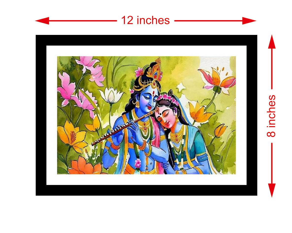 A captivating artwork depicting Krishna's flute serenade to Radha amidst a lush lotus garden. The colors are vibrant and the print quality perfectly captures the portrait's intricate details. The reprint's stunning composition breathes new life into the portrait, a visual masterpiece. Versatile Decor: Ideal for enhancing the aesthetic appeal of living rooms and bedrooms Enhanced Durability: Weather-shield laminated digital print for lasting vibrancy and protection Premium Framing: Constructed with a high-quality, durable fiber frame for long-term stability Precise Dimensions: 30 cm x 20 cm x 1 cm
