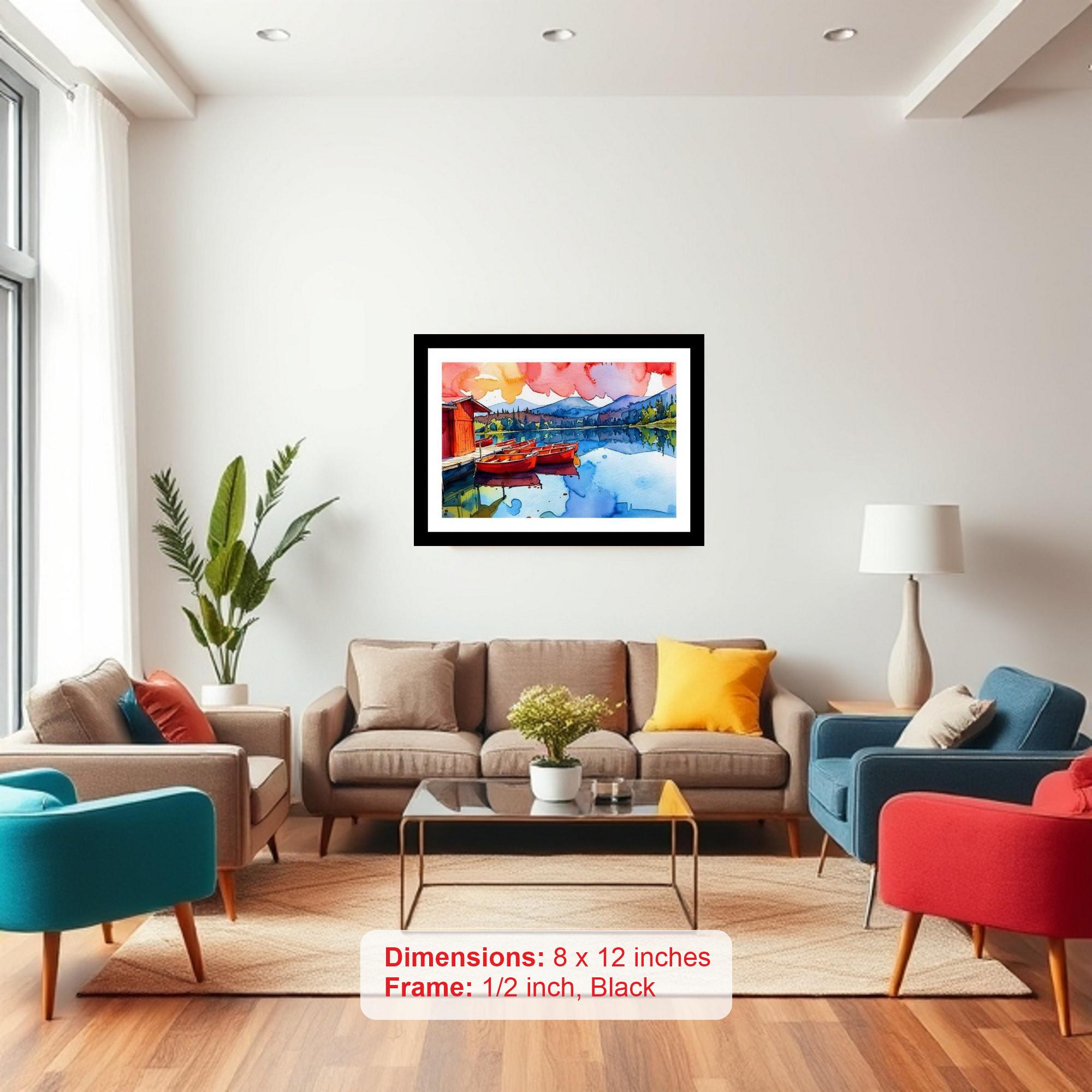 Red Boats Sunset Lakeside Portrait - Serene Wall Art, Interior Accents, Framing Solutions, Residential/Commercial Decor, Premium Gifts | Size: 8 x 12 inches