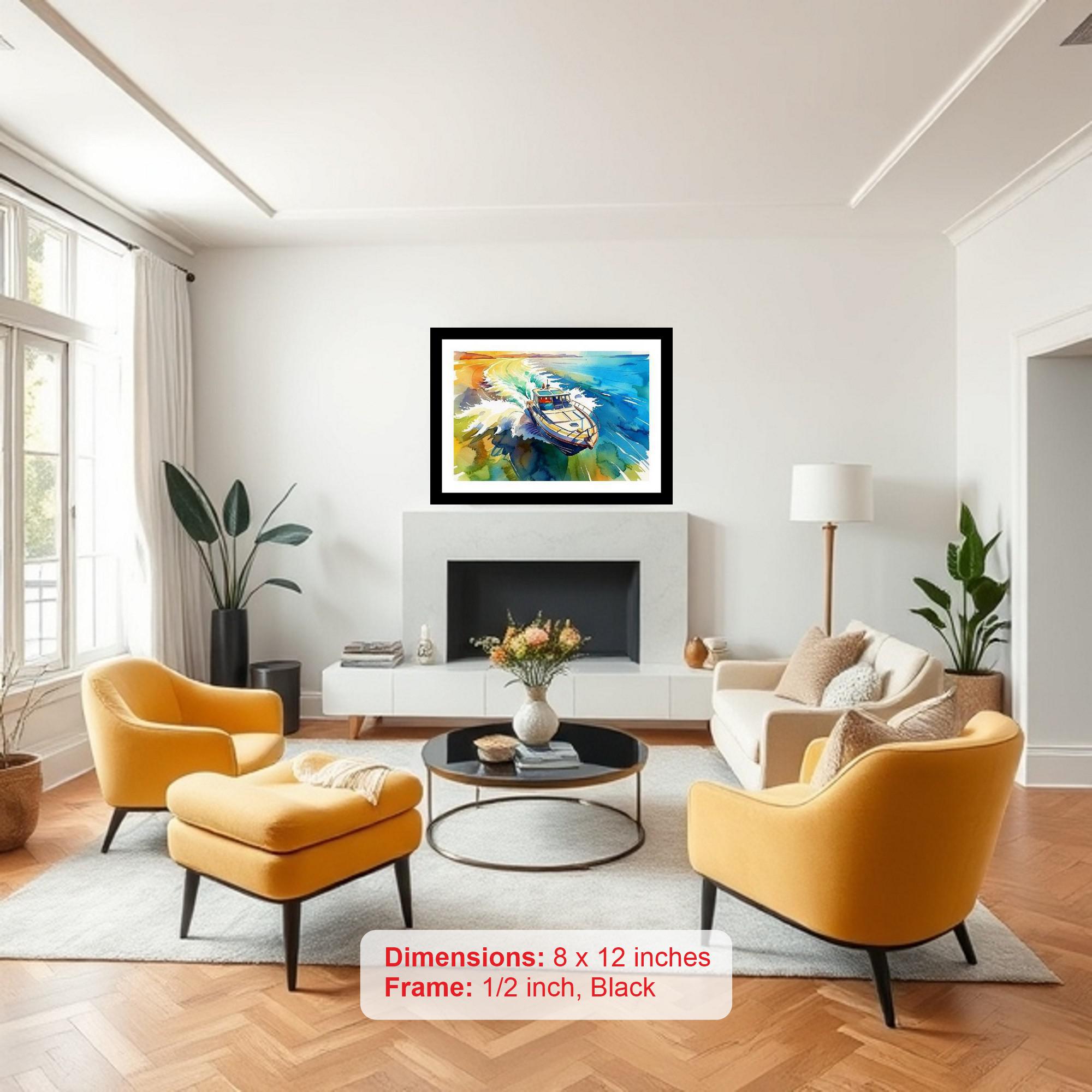 Capture the exhilarating essence of vintage watersports with this exquisite digital reprint, showcasing a golden-framed portrait of a speedboat gracefully slicing through turquoise waters. The artwork depicts a classic speedboat, a symbol of mid-century leisure and high-octane fun, leaving behind a vibrant, frothy wake that accentuates the boat's speed and power. The turquoise water, rendered in hues that evoke a sense of serenity and adventure, provides a stunning contrast to the gleaming hull of the speedboat. Encased in an elegant black frame, this reprint exudes a timeless charm, lending a touch of sophistication and nostalgia to any space. Perfect for adding a splash of color and a hint of retro glamour to your living room, office, or nautical-themed decor, this framed print is more than just a picture; it's a window into a bygone era of carefree days on the water. Whether you're a vintage enthusiast, a boating aficionado, or simply appreciate the beauty of classic art, this piece will undoubtedly become a cherished addition to your collection, sparking conversation and evoking memories of sun-drenched adventures.