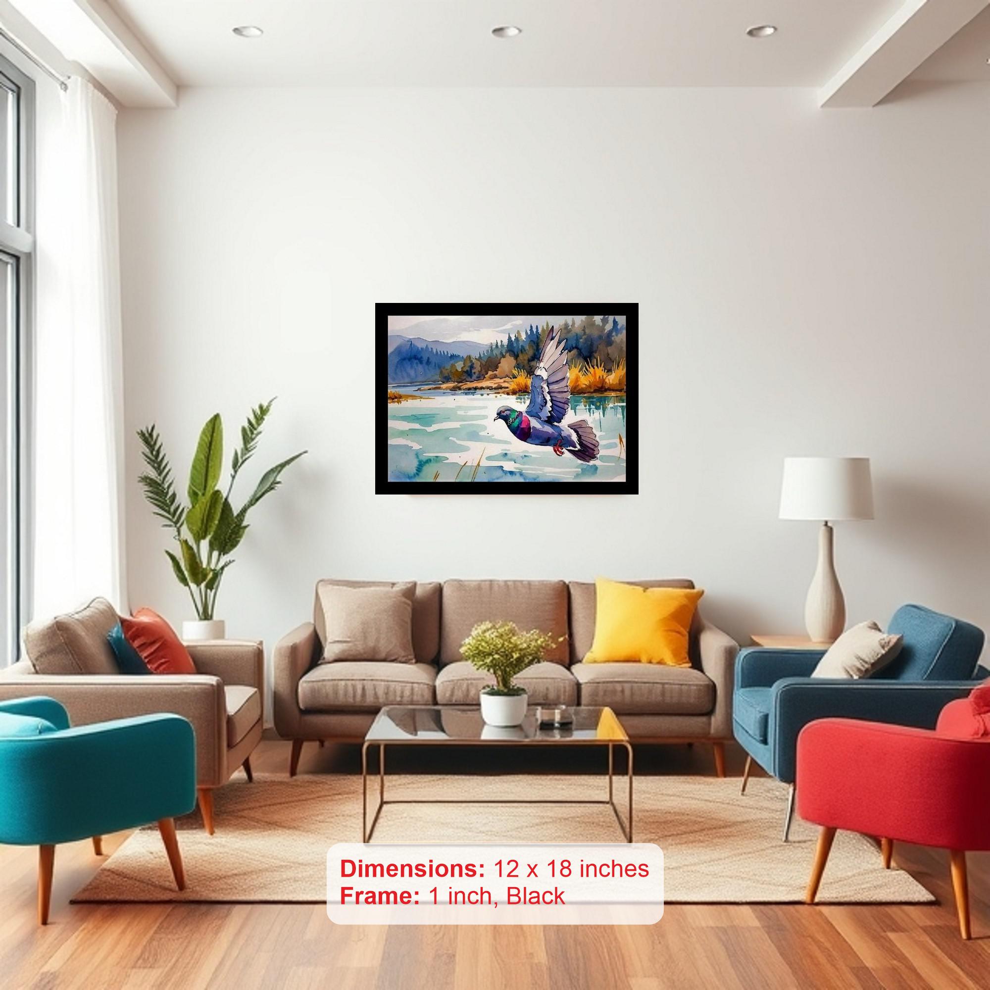 A vibrant pigeon soars over a serene lake in a picturesque landscape, a stunning artwork! The reprint bursts with vibrant colors and the print captures every delicate detail of the original portrait. The digital reprint boasts a striking composition, breathing new life into the portrait's inherent beauty. Versatile Decor: Ideal for enhancing the aesthetic appeal of living rooms and bedrooms Enhanced Durability: Weather-shield laminated digital print for lasting vibrancy and protection Premium Framing: Constructed with a high-quality, durable fiber frame for long-term stability Precise Dimensions: 30 cm x 20 cm x 1 cm