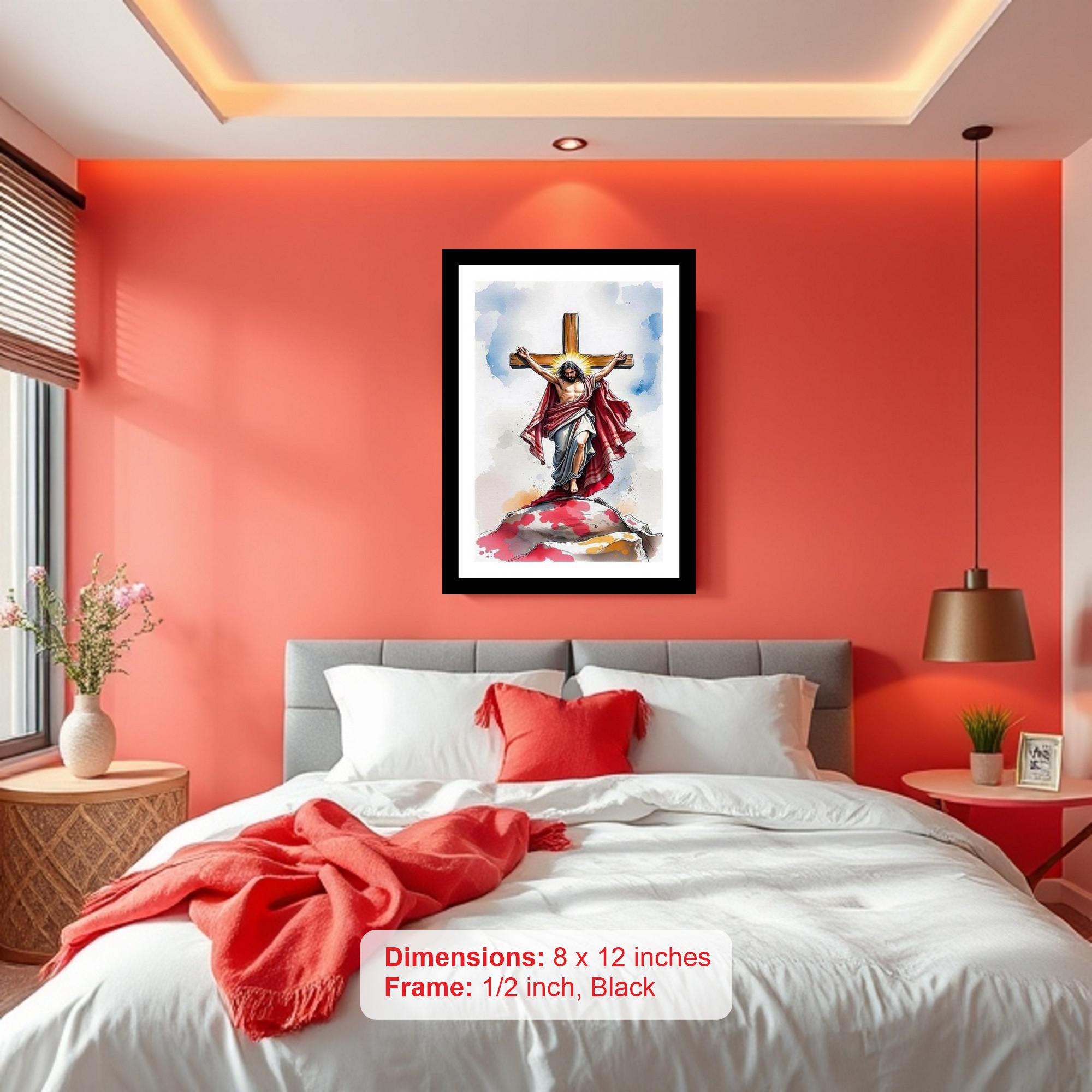 Adorn your home with this exquisite vintage-inspired digital reprint, elegantly framed in a golden hue. This powerful portrait depicts Jesus Christ, resurrected, standing triumphantly atop a rugged rock. The detail is striking; his flowing robe bears the poignant marks of his sacrifice, stained with the blood that signifies redemption and everlasting life. The black frame adds a touch of classic sophistication, perfectly complementing the artwork and enhancing its timeless appeal. This piece serves as a beautiful reminder of faith, hope, and the enduring power of love, making it a meaningful addition to any living room, bedroom, or study. It is a visual testament to spiritual strength and a conversation starter that invites reflection and peace. Perfect as a thoughtful gift for loved ones or as a cherished heirloom for generations to come.