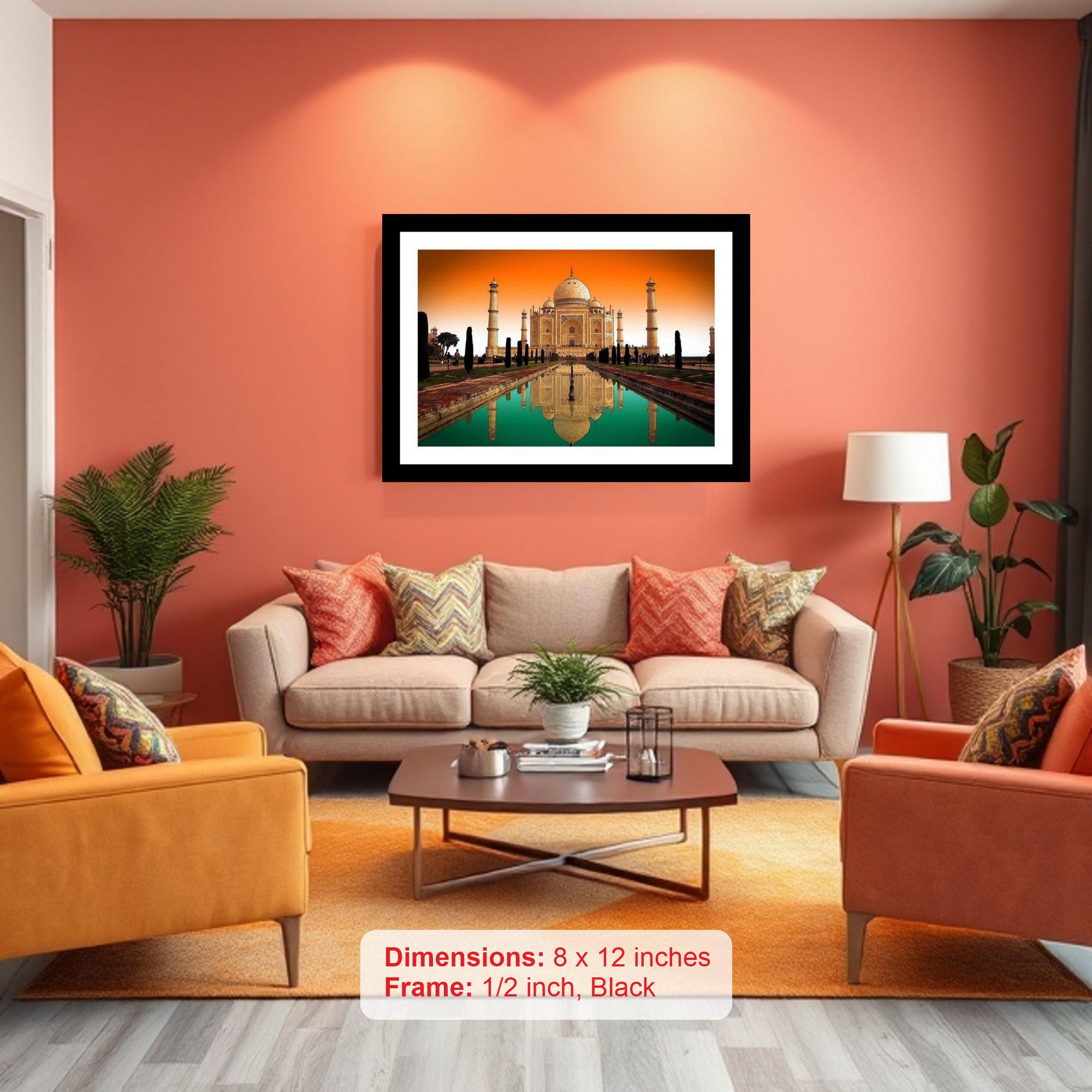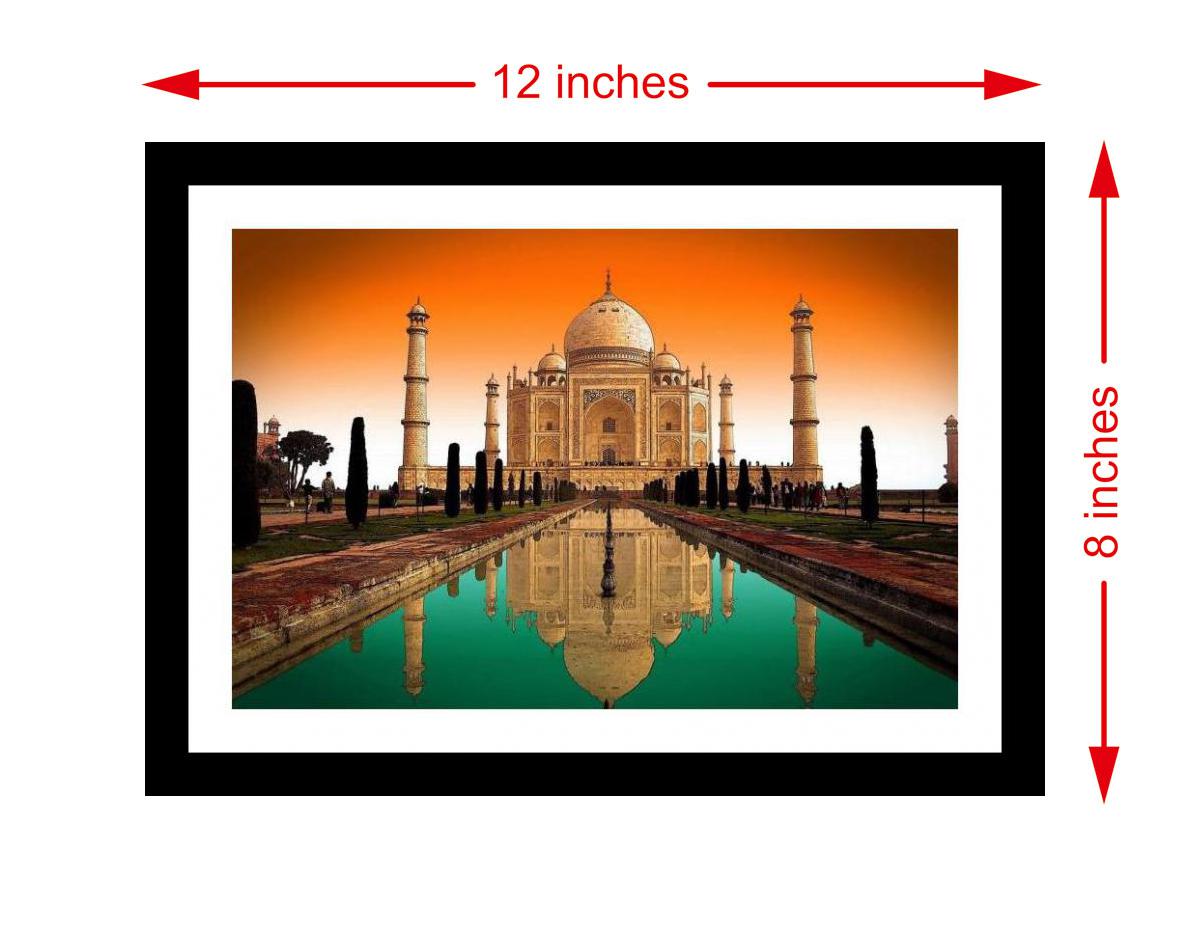 The Taj Mahal's reflected glory, bathed in sunset hues, a serene masterpiece captured with breathtaking precision. The reprint bursts with life! Colors are vibrant, and the print captures every delicate detail of the original portrait. The reprint boasts striking composition, faithfully capturing the portrait's beauty in stunning digital detail. Versatile Decor: Ideal for enhancing the aesthetic appeal of living rooms and bedrooms Enhanced Durability: Weather-shield laminated digital print for lasting vibrancy and protection Premium Framing: Constructed with a high-quality, durable fiber frame for long-term stability Precise Dimensions: 30 cm x 20 cm x 1 cm