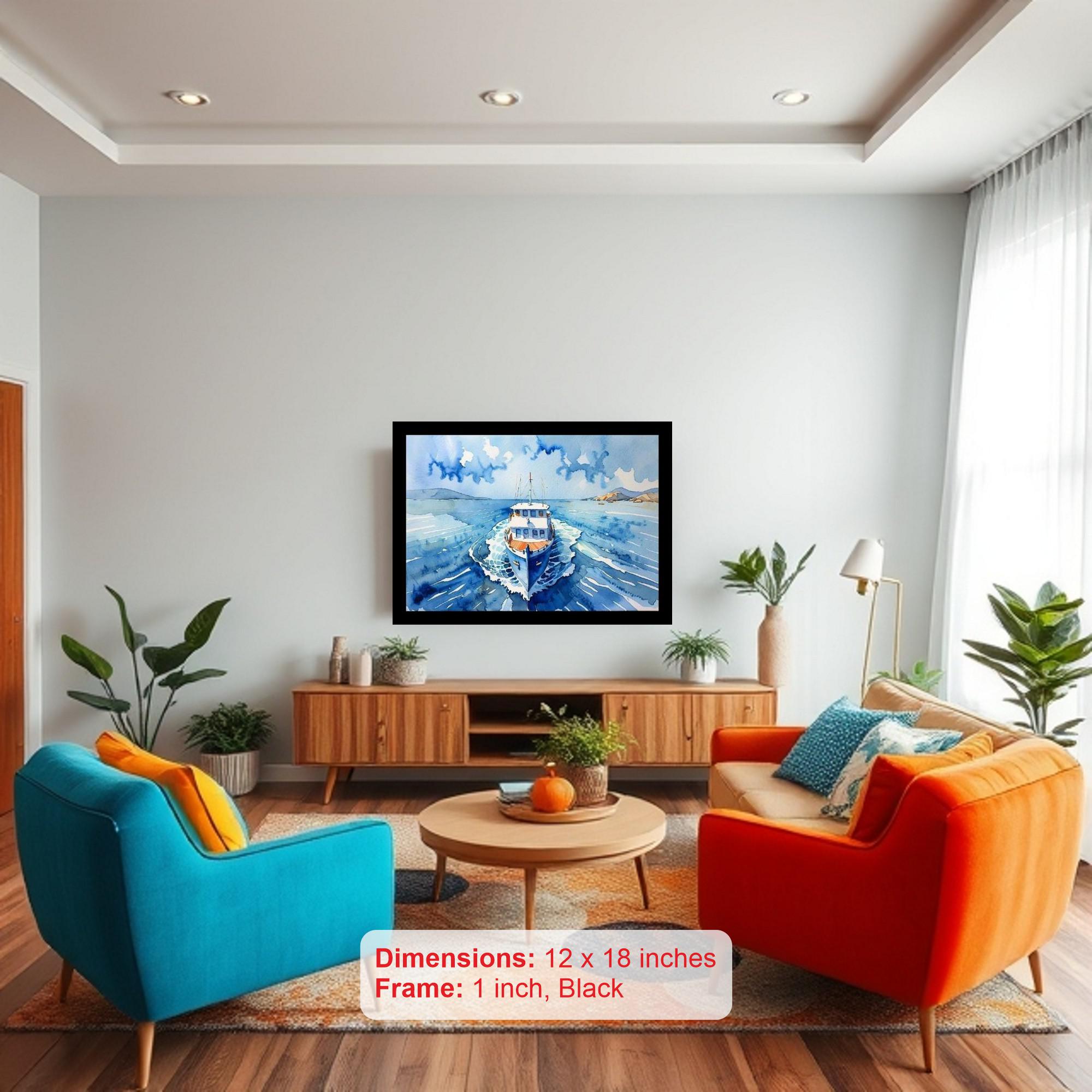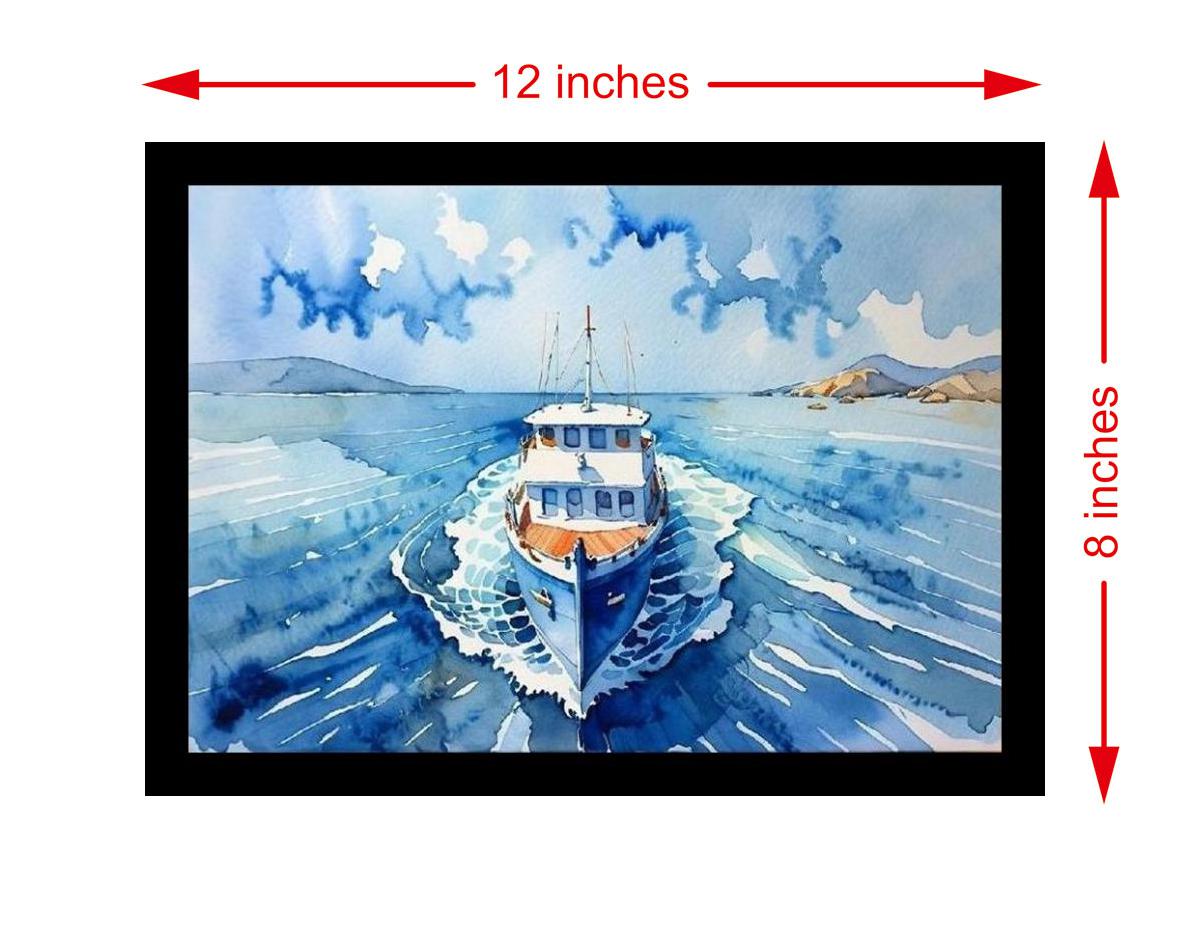 A vibrant painting captures the essence of a blue boat sailing on turquoise waters under a bright sky. The reprint's colors are vibrant and the print quality is so sharp, it feels like the original portrait. The digital reprint boasts a strikingly composed portrait, preserving its beauty with impeccable clarity. Versatile Decor: Ideal for enhancing the aesthetic appeal of living rooms and bedrooms Enhanced Durability: Weather-shield laminated digital print for lasting vibrancy and protection Premium Framing: Constructed with a high-quality, durable fiber frame for long-term stability Precise Dimensions: 30 cm x 20 cm x 1 cm