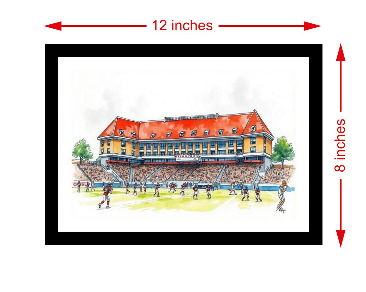 Capture the electrifying energy of game day with this vintage-inspired digital reprint. Encased in an elegant black frame, this vibrant illustration depicts a packed football stadium, a kaleidoscope of color and roaring excitement as the game unfolds on the field. The artwork beautifully evokes a sense of nostalgia, perfect for adding a touch of classic sporting charm to your home, office, or sports-themed room. A striking conversation piece and a thoughtful gift for any football enthusiast, this framed reprint offers a timeless aesthetic that celebrates the passion and spectacle of America's favorite pastime.