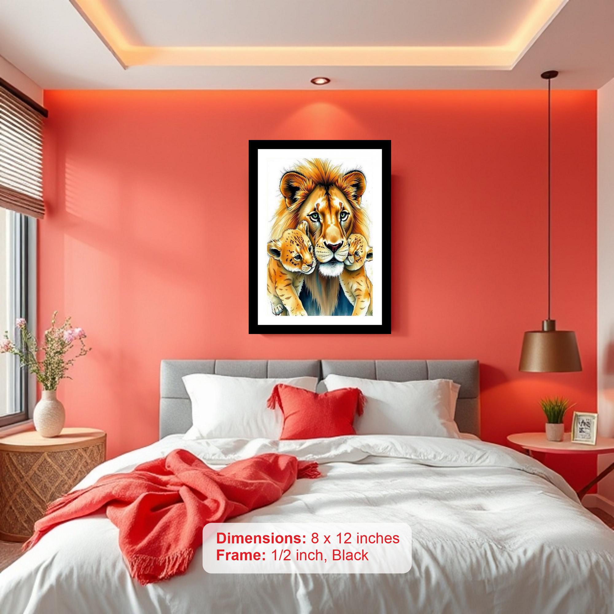 A heartwarming masterpiece: a majestic lion's tender embrace of his cubs captures familial love beautifully. The colors pop, and the print captures every delicate detail of the original portrait beautifully. The portrait's digital reprint boasts a striking composition, breathing new life into the original's beauty. Versatile Decor: Ideal for enhancing the aesthetic appeal of living rooms and bedrooms Enhanced Durability: Weather-shield laminated digital print for lasting vibrancy and protection Premium Framing: Constructed with a high-quality, durable fiber frame for long-term stability Precise Dimensions: 30 cm x 20 cm x 1 cm