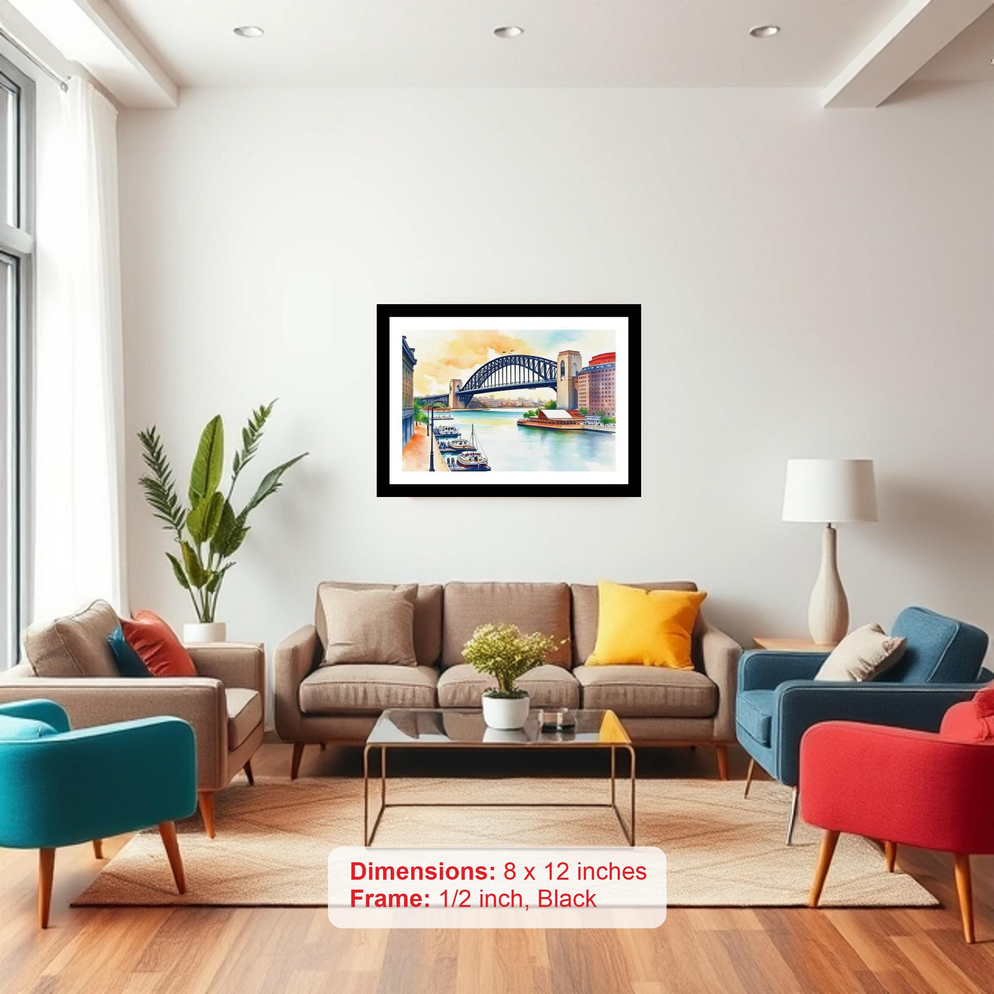 Capture the timeless beauty of Sydney with this elegant digital reprint featuring a vintage-style portrait of the iconic Harbour Bridge at sunset. Housed in a stunning black frame, this artwork evokes a sense of nostalgia and sophistication. Watch as gentle boats bob serenely on the shimmering harbor waters below, perfectly capturing the city's vibrant atmosphere. This piece adds a touch of classic charm to any living space or office.