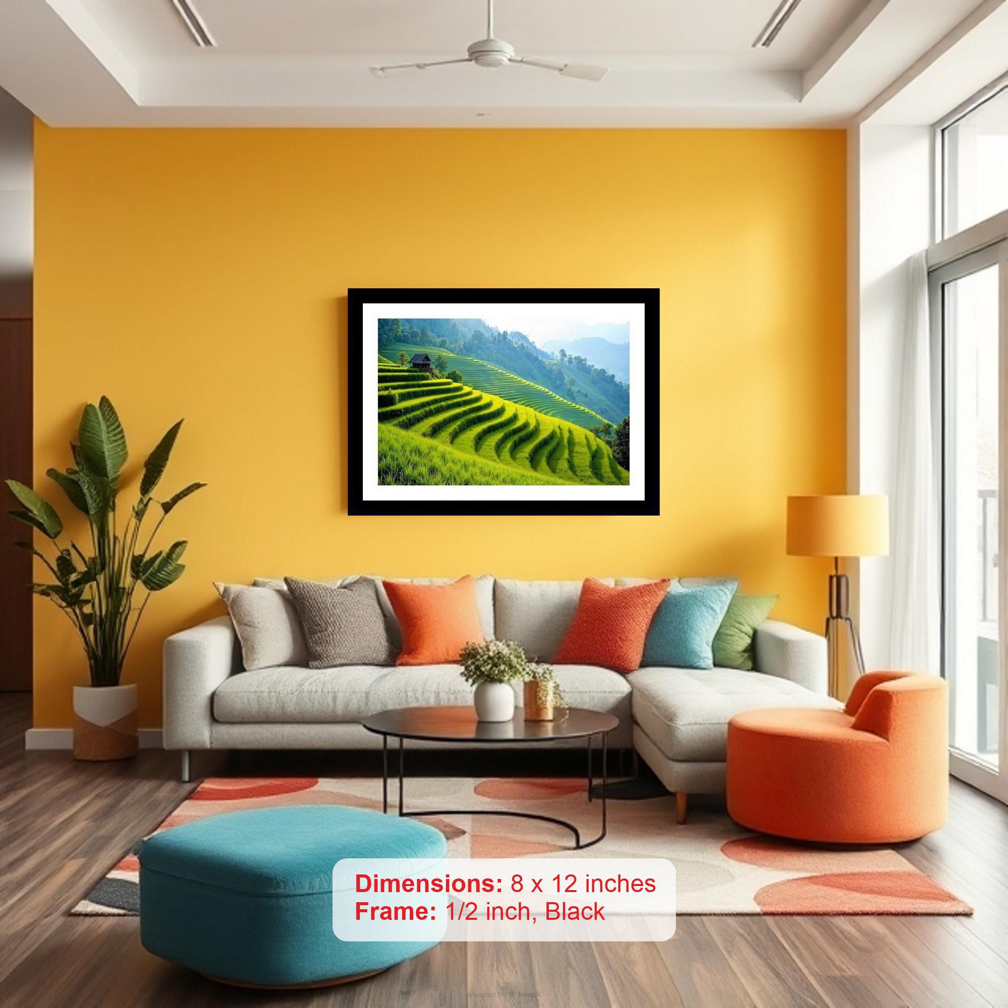Elevate your home decor with this vintage-inspired digital reprint showcasing serene rice terraces. Cascading down a verdant hillside, the lush green landscape features a charming house nestled within, creating a tranquil and captivating scene. Encased in an elegant black frame, this piece adds a touch of timeless sophistication to any room. Perfect for adding a peaceful and artistic focal point to your living room, bedroom, or office.