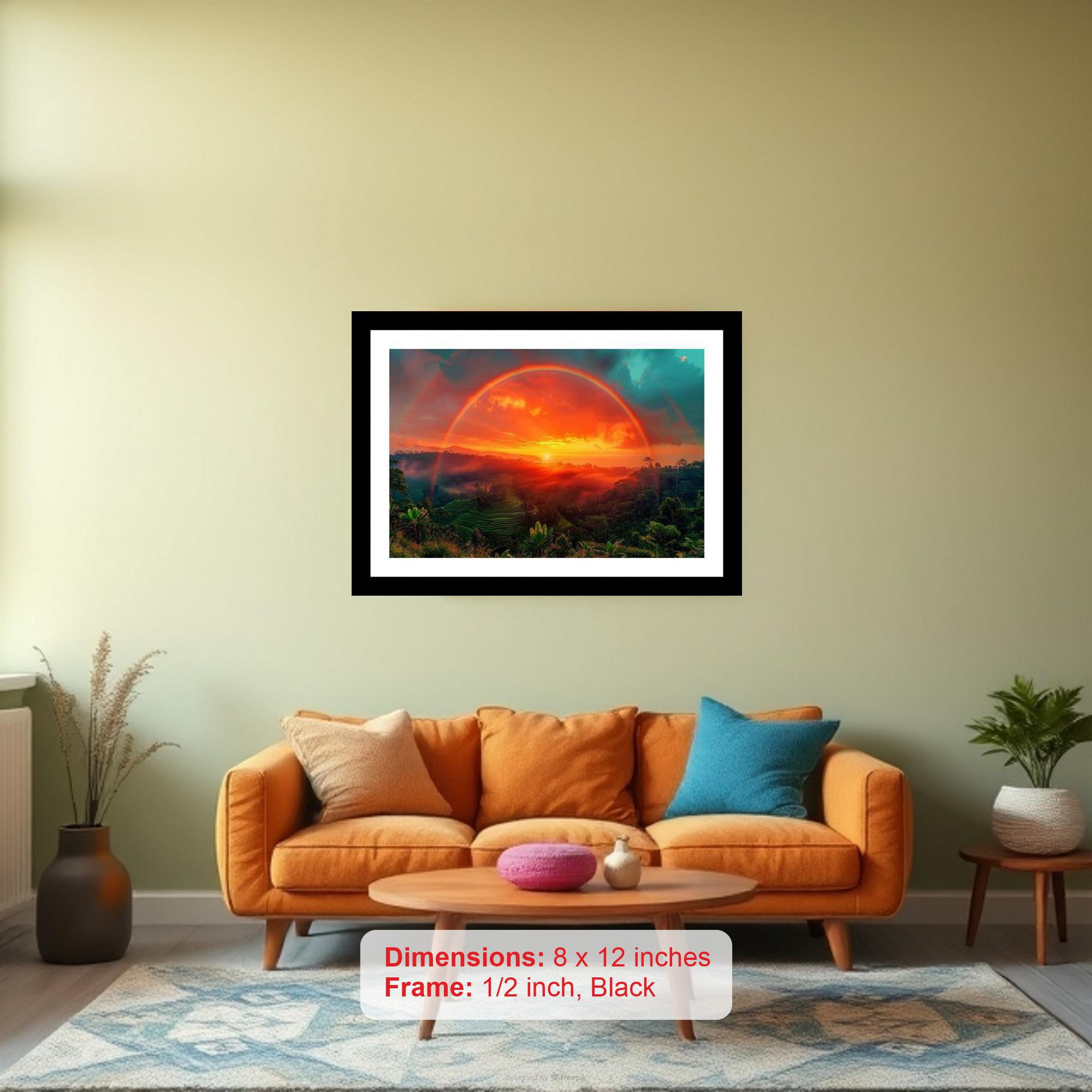 Capture the breathtaking beauty of nature with this vintage-inspired black framed digital reprint. This elegant piece showcases a vibrant rainbow arcing gracefully over a fiery sunset, casting a warm glow upon the lush green rice terraces below. The photograph's stunning composition and rich colors are enhanced by the classic black frame, adding a touch of timeless sophistication to any room. Perfect for adding a calming yet captivating focal point to your living room, bedroom, or office, this ready-to-hang print brings the serenity of the countryside and the magic of a perfect sunset into your home. It's an ideal gift for nature lovers, photography enthusiasts, or anyone seeking to elevate their decor with a touch of vibrant, vintage charm.