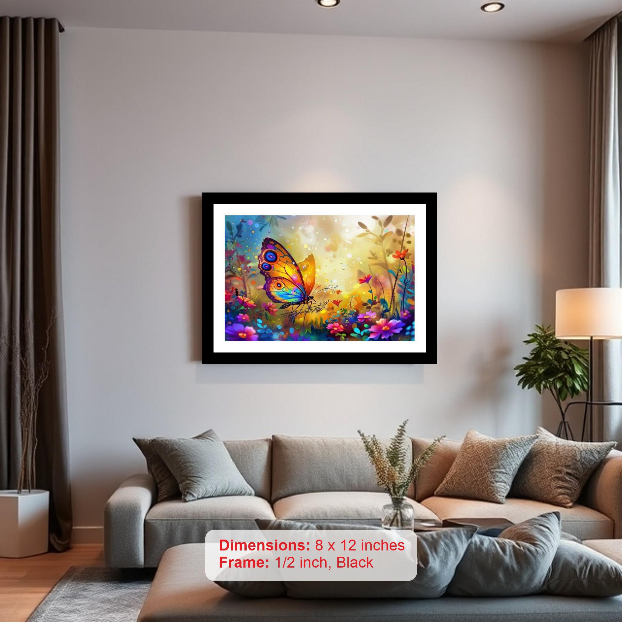 Add a touch of timeless elegance to your home with this vintage-inspired digital reprint. Encased in a stunning black frame, this artwork features a vibrant rainbow butterfly gracefully perched amidst a field bursting with colorful, fantastical flowers. The intricate details and rich hues of the butterfly and blossoms create a captivating scene, reminiscent of classic portraiture with a whimsical twist. This piece is perfect for adding a pop of color and sophistication to any room, whether it's your living room, bedroom, or office. It's a beautiful and affordable way to bring a touch of vintage charm and artistic flair into your space.