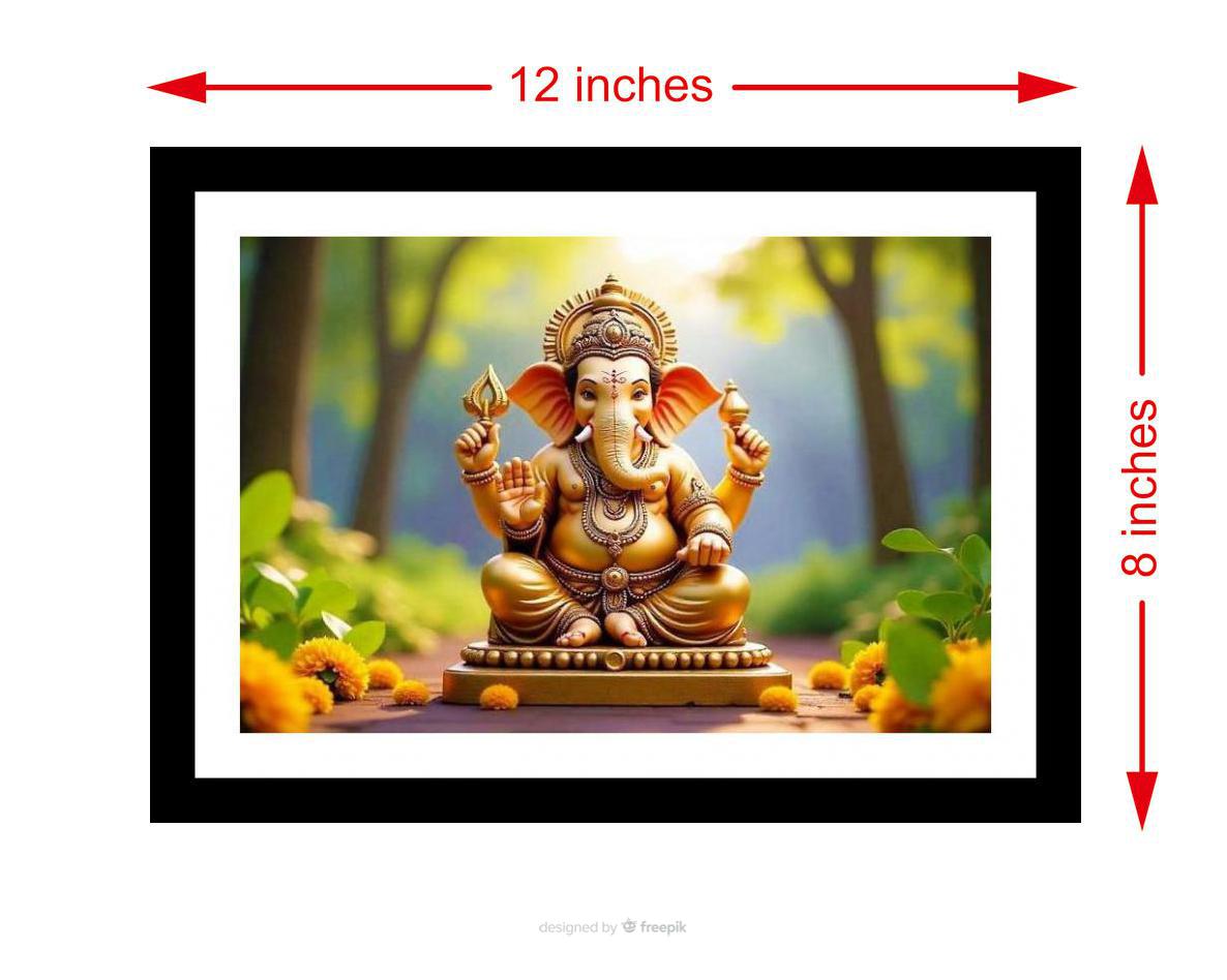 Golden Ganesha radiates peace amidst a vibrant, flourishing paradise. Colors pop, details are crisp - a faithful and vibrant recreation of a beautiful photo. The digital reprint boasts a strikingly composed image, expertly balancing light and shadow for a truly captivating view. Versatile Decor: Ideal for enhancing the aesthetic appeal of living rooms and bedrooms Enhanced Durability: Weather-shield laminated digital print for lasting vibrancy and protection Premium Framing: Constructed with a high-quality, durable fiber frame for long-term stability Precise Dimensions: 30 cm x 20 cm x 1 cm
