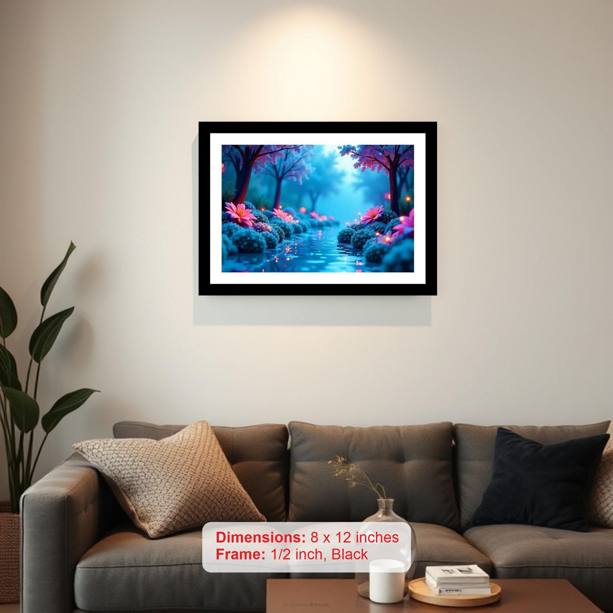 Bring timeless beauty to your home with this vintage-inspired digital reprint. Encased in a stunning black frame, this elegant piece captures an enchanted stream bathed in soft, ethereal light, adorned with delicate pink blossoms. The photograph's reprint showcases a magical scene, evoking a sense of tranquility and wonder. Perfect for adding a touch of sophistication and serenity to any room, this framed print makes a captivating focal point or a thoughtful gift, infusing your space with a touch of vintage charm and dreamy ambiance.