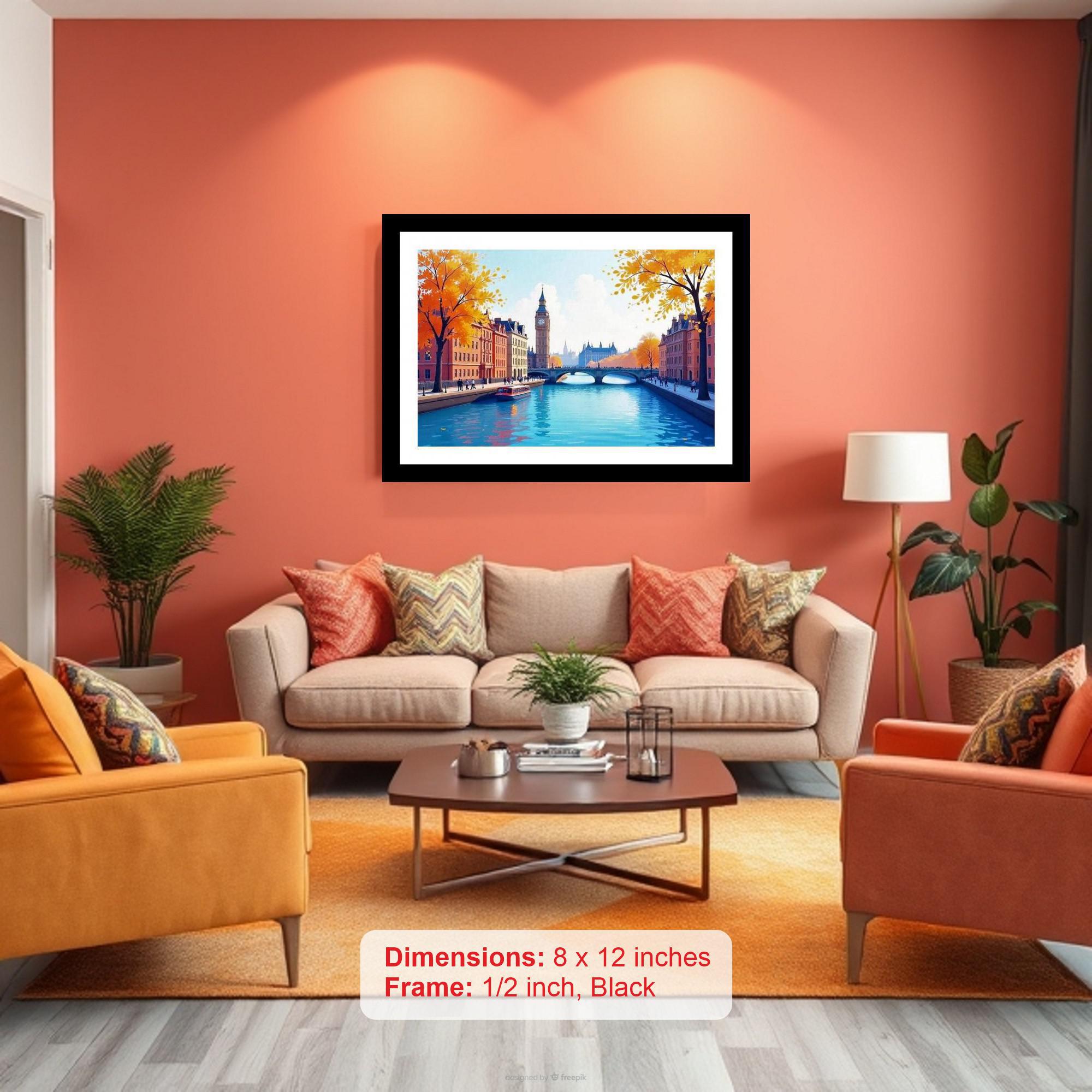 Evoke timeless London charm with this vintage-inspired black framed digital reprint. Capturing an autumnal scene, this elegant portrait features the iconic Big Ben alongside a picturesque river view, reminiscent of a bygone era. The rich black frame enhances the artwork's warmth and sophistication, making it a stunning focal point for any room. Perfect for adding a touch of classic British elegance to your home or office, this piece offers enduring beauty and a captivating glimpse into London's historical allure.