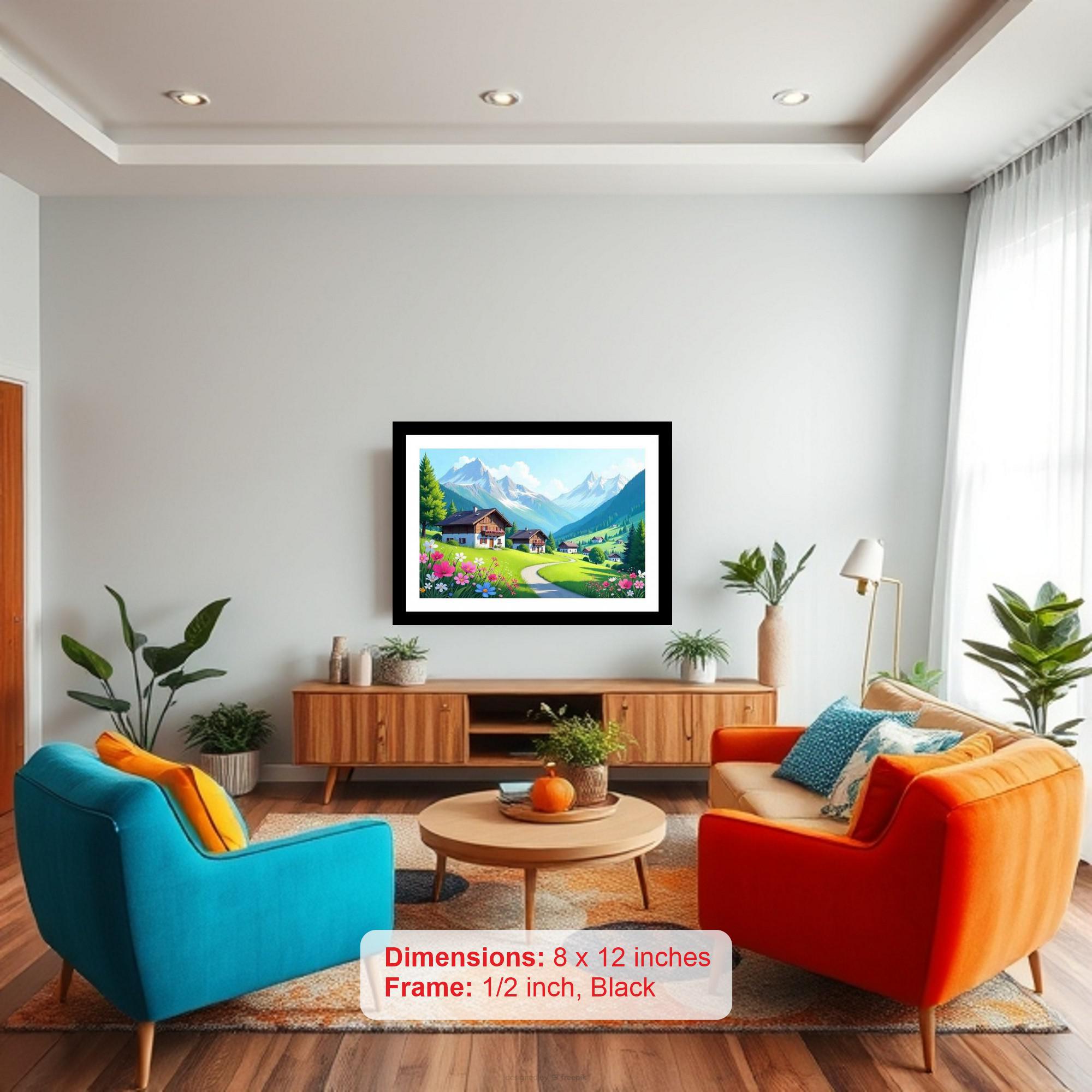 Bring timeless charm to your home with this elegant digital reprint of a captivating alpine village scene. Nestled in a vibrant valley, the picturesque village exudes rustic beauty, while majestic mountains rise dramatically in the background. The artwork is presented in a vintage-style black frame, adding a touch of classic sophistication to any room. This stunning piece is perfect for adding warmth and character to your living room, bedroom, office, or hallway. Its serene beauty and nostalgic feel will transport you to a tranquil alpine escape every time you gaze upon it. Enjoy the allure of vintage art with the clarity and durability of a modern digital reprint. A truly enchanting addition to your decor.