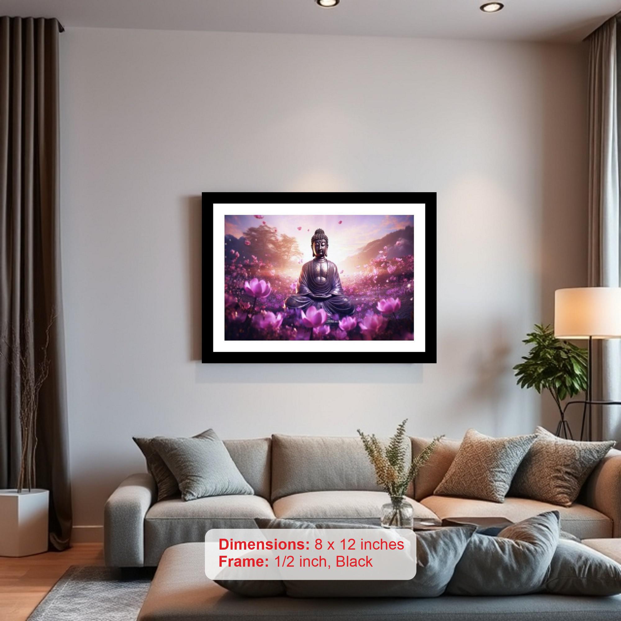 Find tranquility with our classic black framed digital reprint featuring a serene Buddha statue meditating peacefully in a field of vibrant pink flowers. This elegant piece evokes a sense of calm and spiritual awakening, perfect for adding a touch of mindful beauty to any home or office. The warm black frame complements the photograph's soft hues, creating a visually appealing and harmonious aesthetic. Bring a touch of zen to your space with this timeless image.