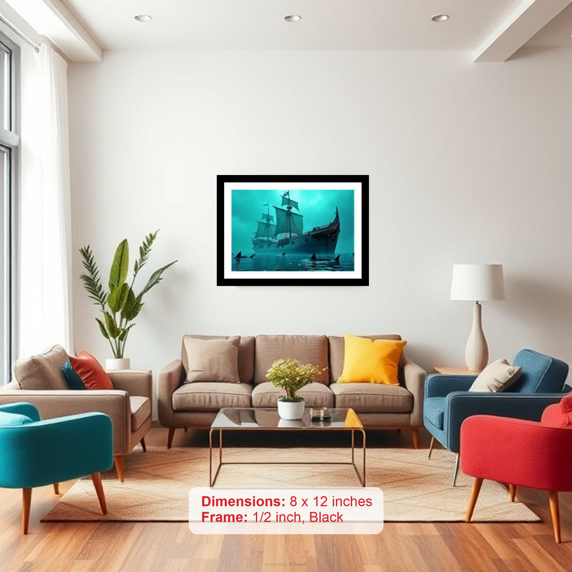 Pirate Ship in Teal Seas: Shark Shadows. Wall Art, Interior Accents, Framing Solutions, Residential/Commercial Decor, Premium Gifts | Size: 8 x 12 inches