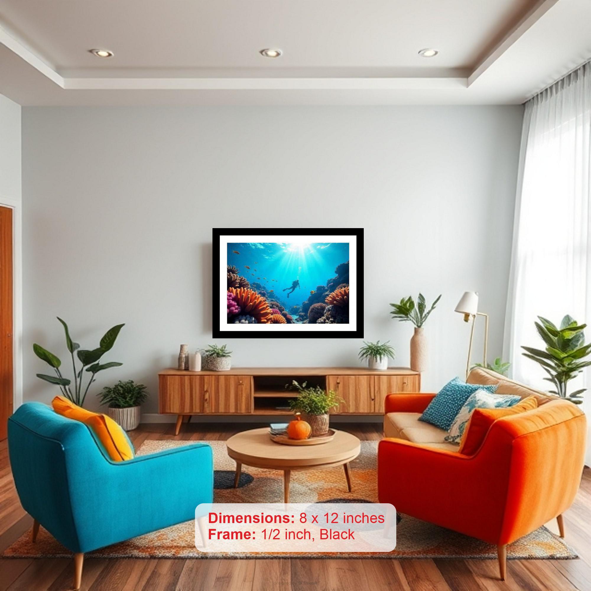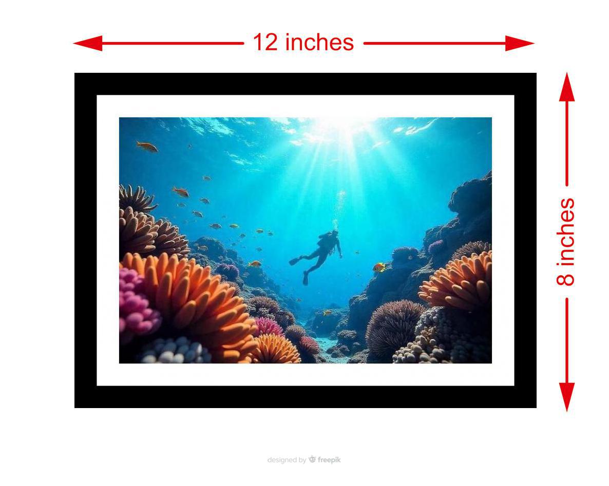 A diver's plunge into a vibrant coral reef captures breathtaking underwater beauty. Colors pop, details sharp - the photo's beauty is truly resurrected in this vibrant, high-quality print. The digital reprint boasts a striking composition, breathing new life into the beautiful original photograph. Versatile Decor: Ideal for enhancing the aesthetic appeal of living rooms and bedrooms Enhanced Durability: Weather-shield laminated digital print for lasting vibrancy and protection Premium Framing: Constructed with a high-quality, durable fiber frame for long-term stability Precise Dimensions: 30 cm x 20 cm x 1 cm