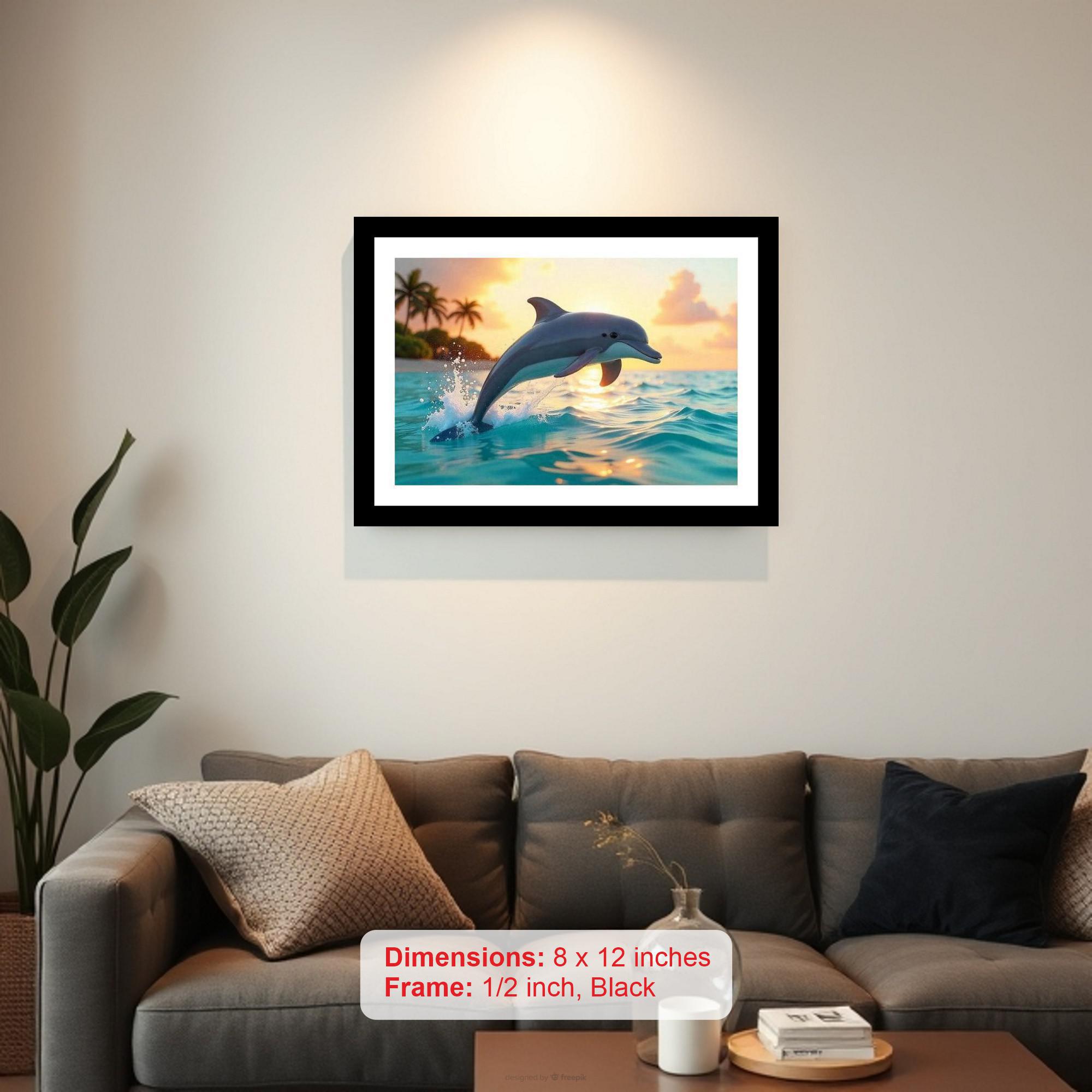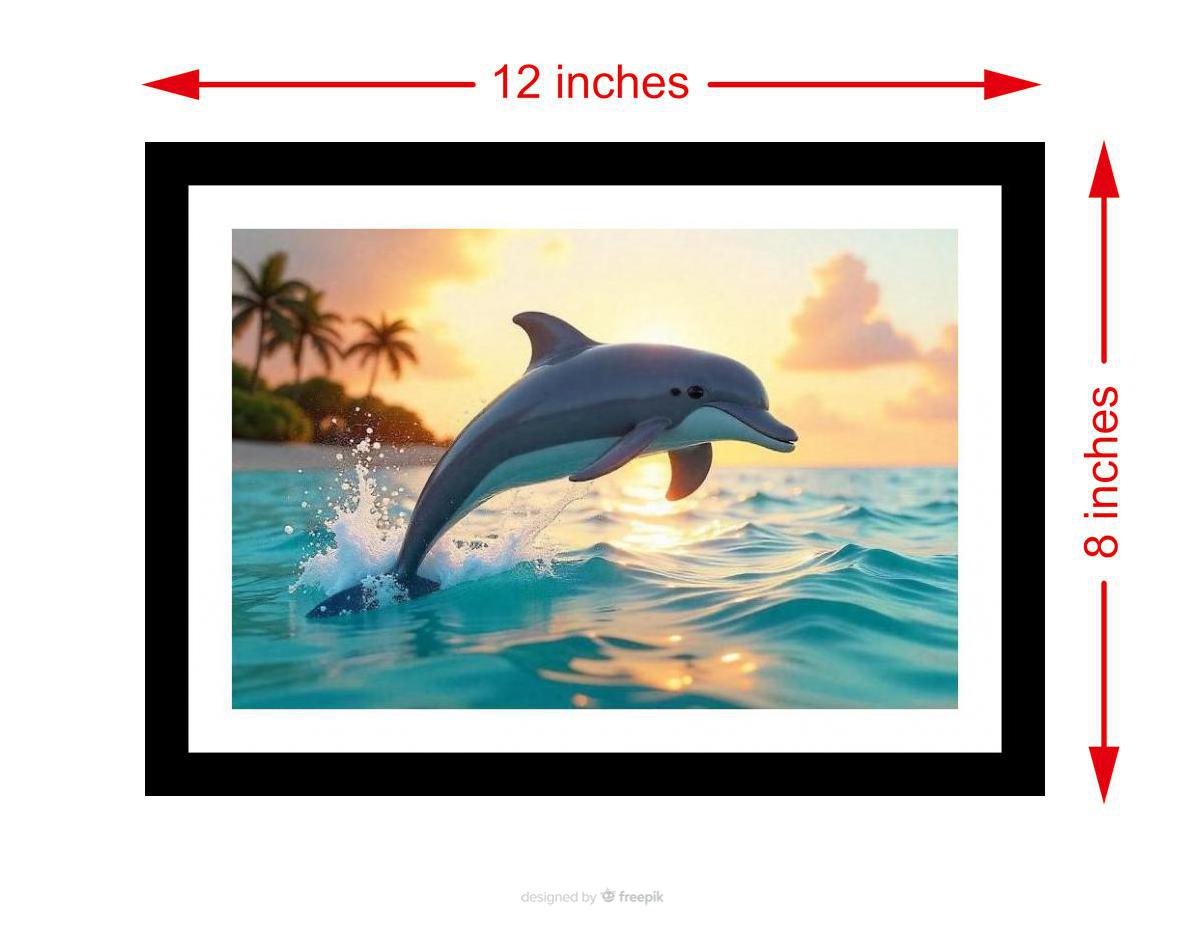 A stunning image of freedom: a dolphin dances with the sunset, perfectly capturing tropical paradise. Colors pop, details sharp - a faithful reproduction of a beautiful photo. The reprint boasts a striking composition; the digital rendering truly captures the photo's original, breathtaking beauty. Versatile Decor: Ideal for enhancing the aesthetic appeal of living rooms and bedrooms Enhanced Durability: Weather-shield laminated digital print for lasting vibrancy and protection Premium Framing: Constructed with a high-quality, durable fiber frame for long-term stability Precise Dimensions: 30 cm x 20 cm x 1 cm