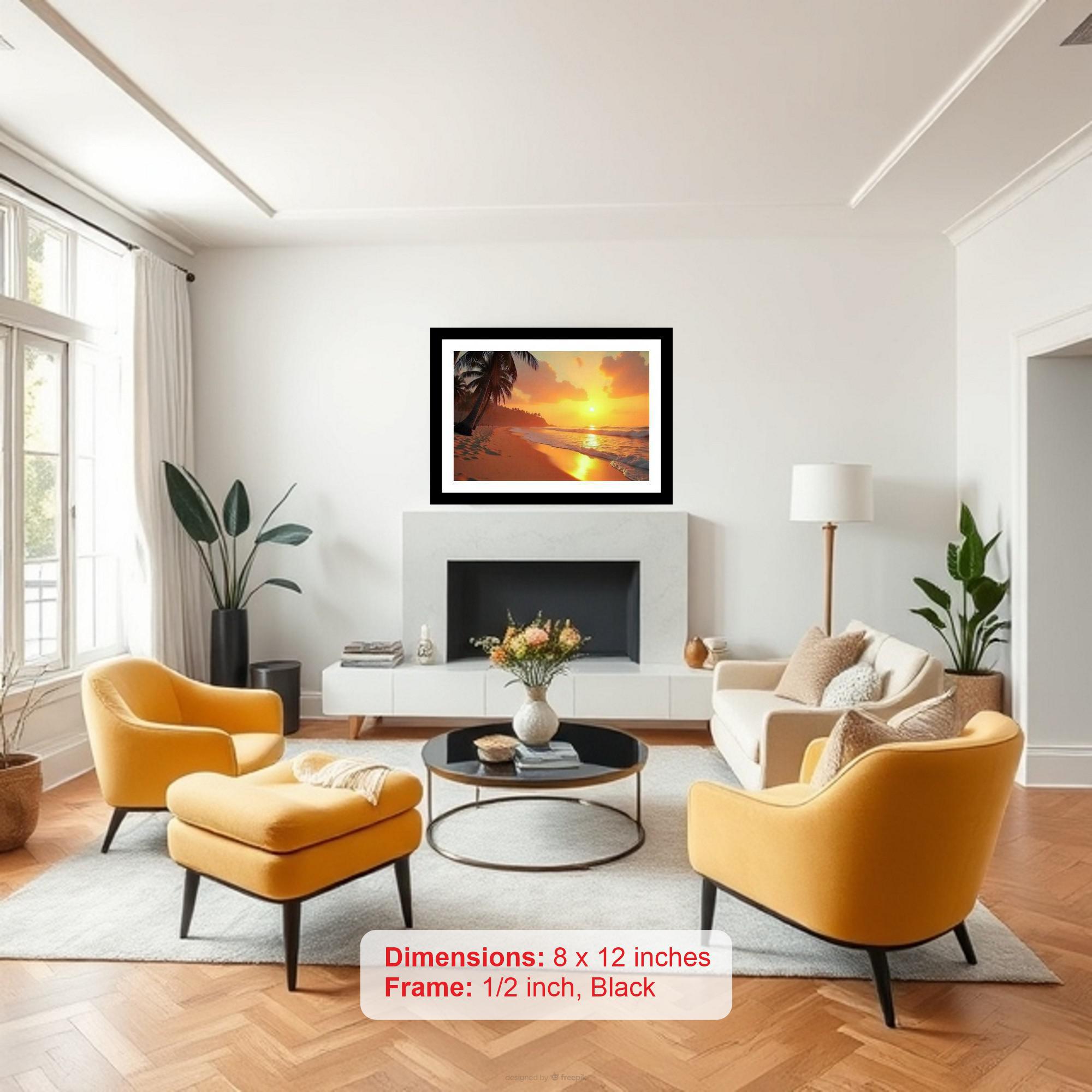 Capture the timeless beauty of a Golden Hour Paradise with this elegant digital reprint. Encased in a vintage-style black frame, this stunning photograph depicts silhouetted palm trees against a breathtaking sunset beach scene. The warm hues of the setting sun cast a radiant glow, creating a serene and idyllic atmosphere. This exquisite piece of wall art adds a touch of sophistication and tranquility to any room, making it a perfect addition to your home decor or a thoughtful gift for someone special. Bring the beauty of a tropical escape into your living space with this captivating framed print, evoking a sense of calm and wonder.