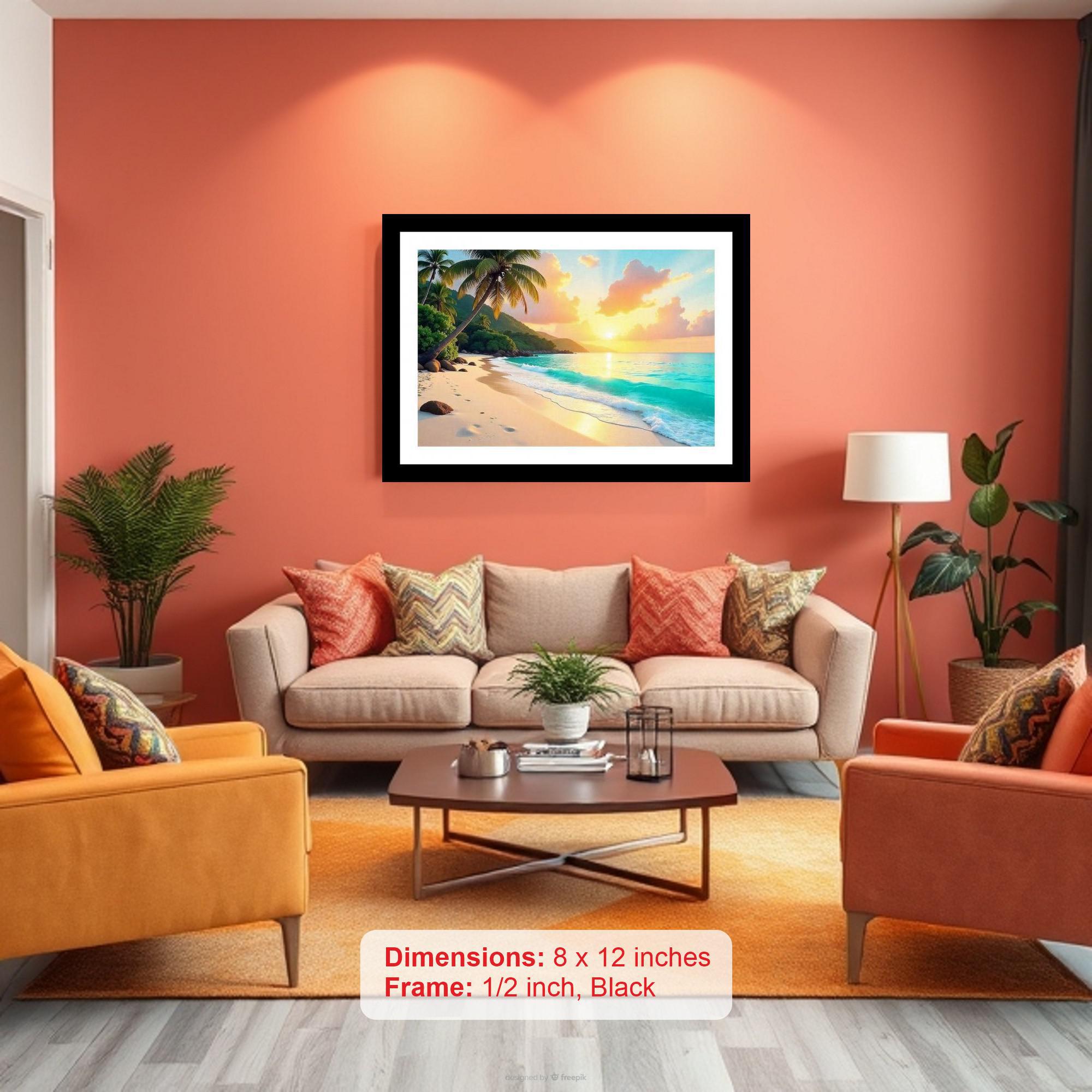 Escape to paradise with this vintage-inspired digital reprint featuring a breathtaking sunset over a pristine beach. The image, digitally enhanced for vibrant color and clarity, is beautifully showcased in an elegant black frame, adding a touch of timeless sophistication to any room. Let the serene beauty of this scene transport you to a place of tranquility and peace, a perfect addition to your home decor or a thoughtful gift for someone special. Experience the allure of paradise every day.