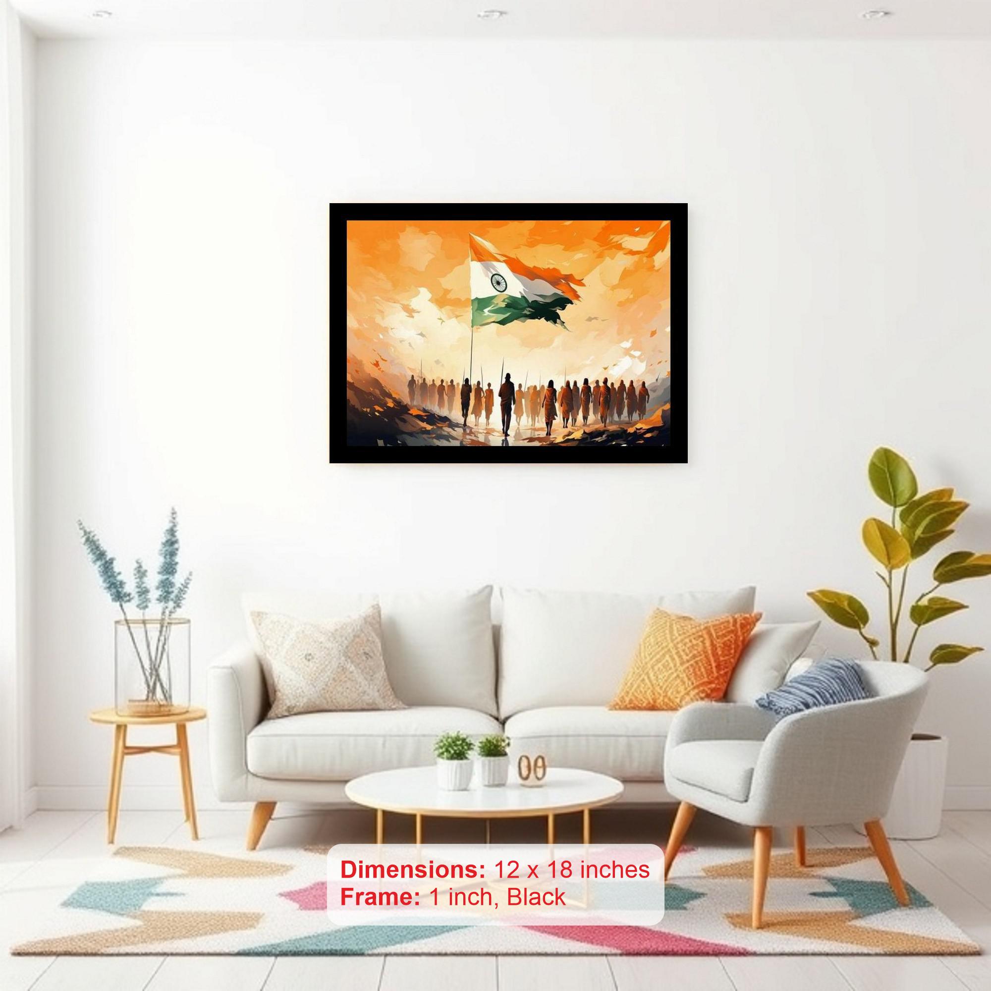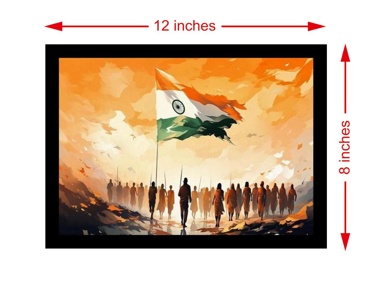 A powerful depiction of unwavering Indian patriotism as a resolute army marches towards a glorious sunrise. The reprint's colors sing and the print is sharp; it truly brings this beautiful portrait to life again! The digital reprint boasts a striking composition, breathing new life into the portrait's captivating beauty. Versatile Decor: Ideal for enhancing the aesthetic appeal of living rooms and bedrooms Enhanced Durability: Weather-shield laminated digital print for lasting vibrancy and protection Premium Framing: Constructed with a high-quality, durable fiber frame for long-term stability Precise Dimensions: 30 cm x 20 cm x 1 cm