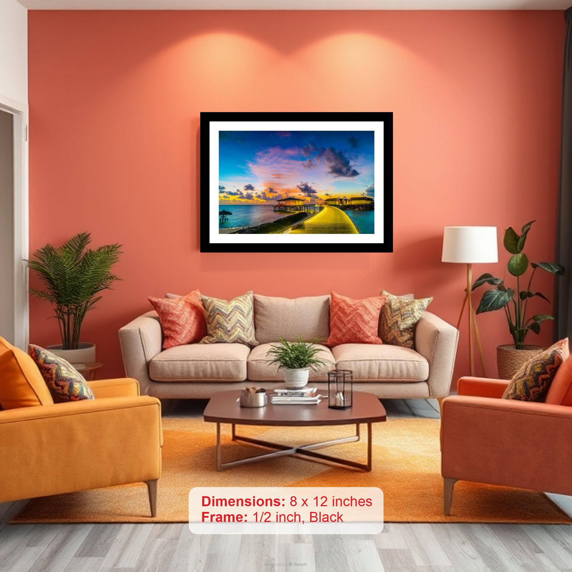 Escape to paradise with this vintage-inspired digital reprint. Featuring a breathtaking sunset over tranquil overwater bungalows and a softly glowing walkway, this photograph evokes serenity and timeless elegance. The print is beautifully presented within a classic black frame, adding a touch of luxury to any space. Perfect for bringing the warmth of a tropical getaway into your home or office, this piece makes a stunning statement and a thoughtful gift. Capture the magic of paradise today!