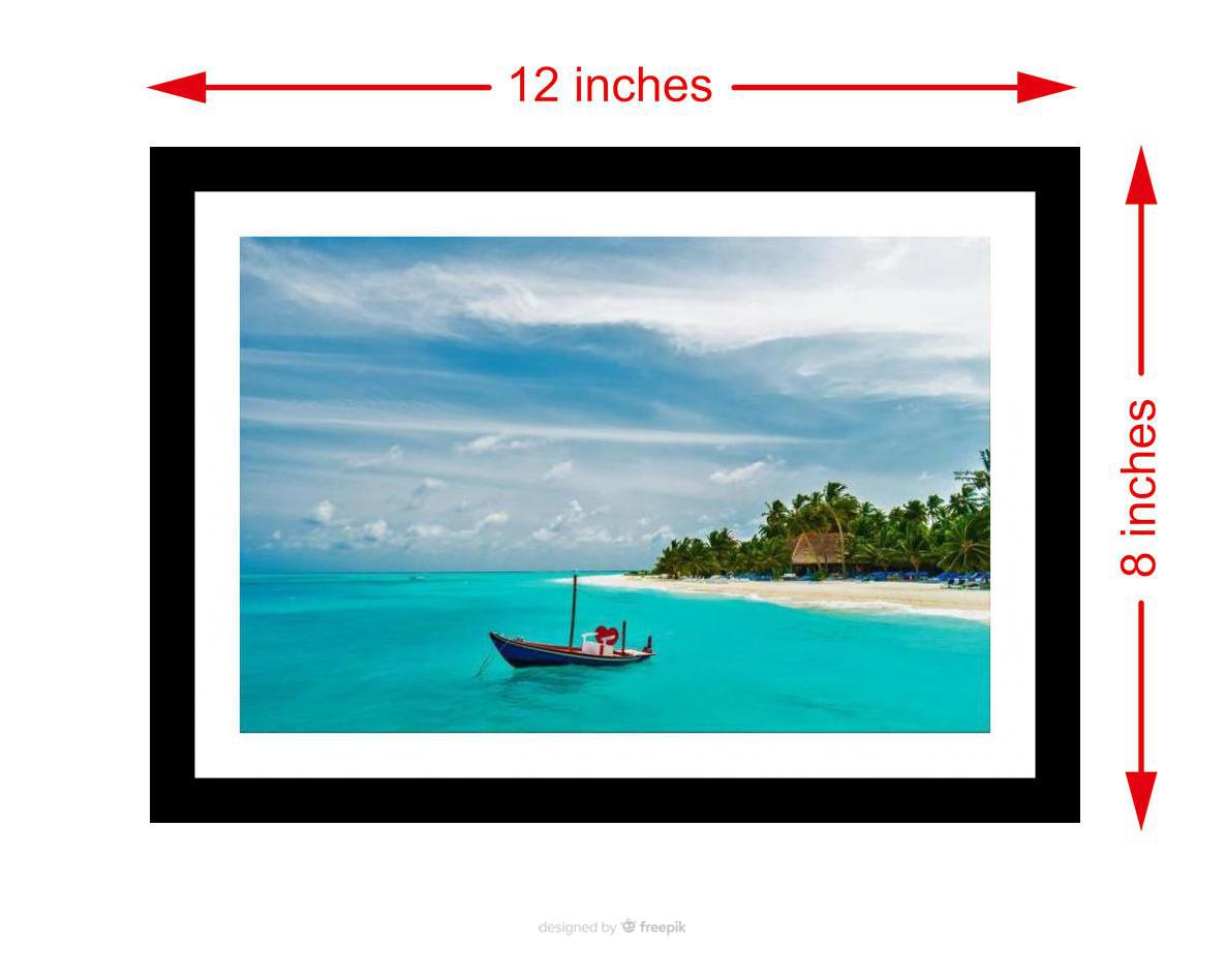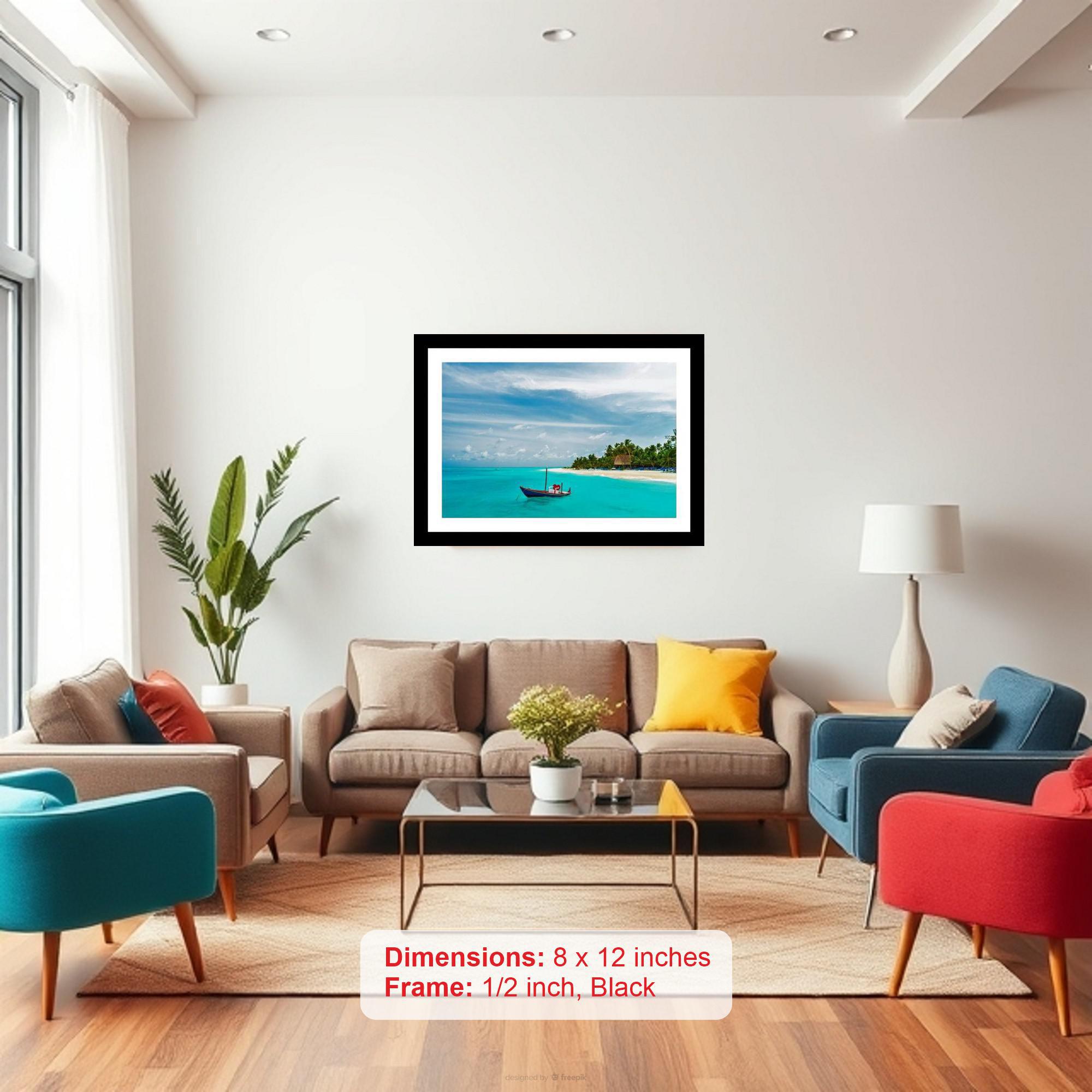 A stunning tropical vista: turquoise waters cradle a charming boat in serene paradise. The colors are vibrant and the print is so sharp, it's like seeing the photo for the first time. The reprint's striking composition elevates the photograph, showcasing its beauty anew. A visual masterpiece! Versatile Decor: Ideal for enhancing the aesthetic appeal of living rooms and bedrooms Enhanced Durability: Weather-shield laminated digital print for lasting vibrancy and protection Premium Framing: Constructed with a high-quality, durable fiber frame for long-term stability Precise Dimensions: 30 cm x 20 cm x 1 cm