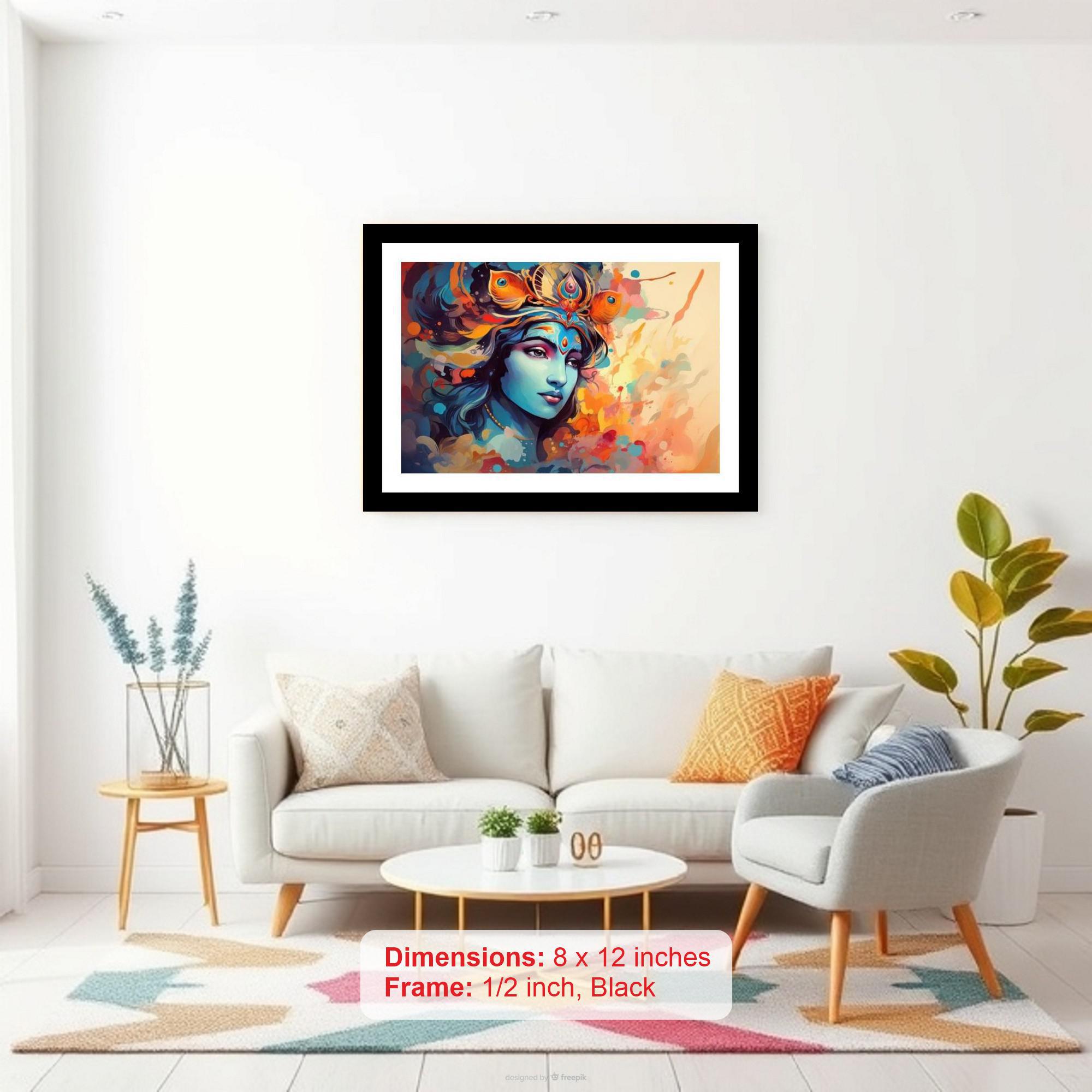 Immerse yourself in divine artistry with this captivating vintage-inspired digital reprint, showcasing a vibrant and abstract portrait of Krishna. Enclosed in an elegant black frame, the artwork features the beloved deity adorned with iconic peacock feathers and painted with radiant colors that evoke a sense of joy, spirituality, and artistic wonder. This piece brings a touch of timeless beauty and cultural richness to any space, whether it's your living room, meditation area, or office. The high-quality digital reprint ensures exceptional detail and color fidelity, preserving the essence of the original artwork. This framed portrait serves as a beautiful visual reminder of devotion and artistic expression, making it a cherished addition to your home decor or a thoughtful gift for loved ones who appreciate fine art and spiritual symbolism.
