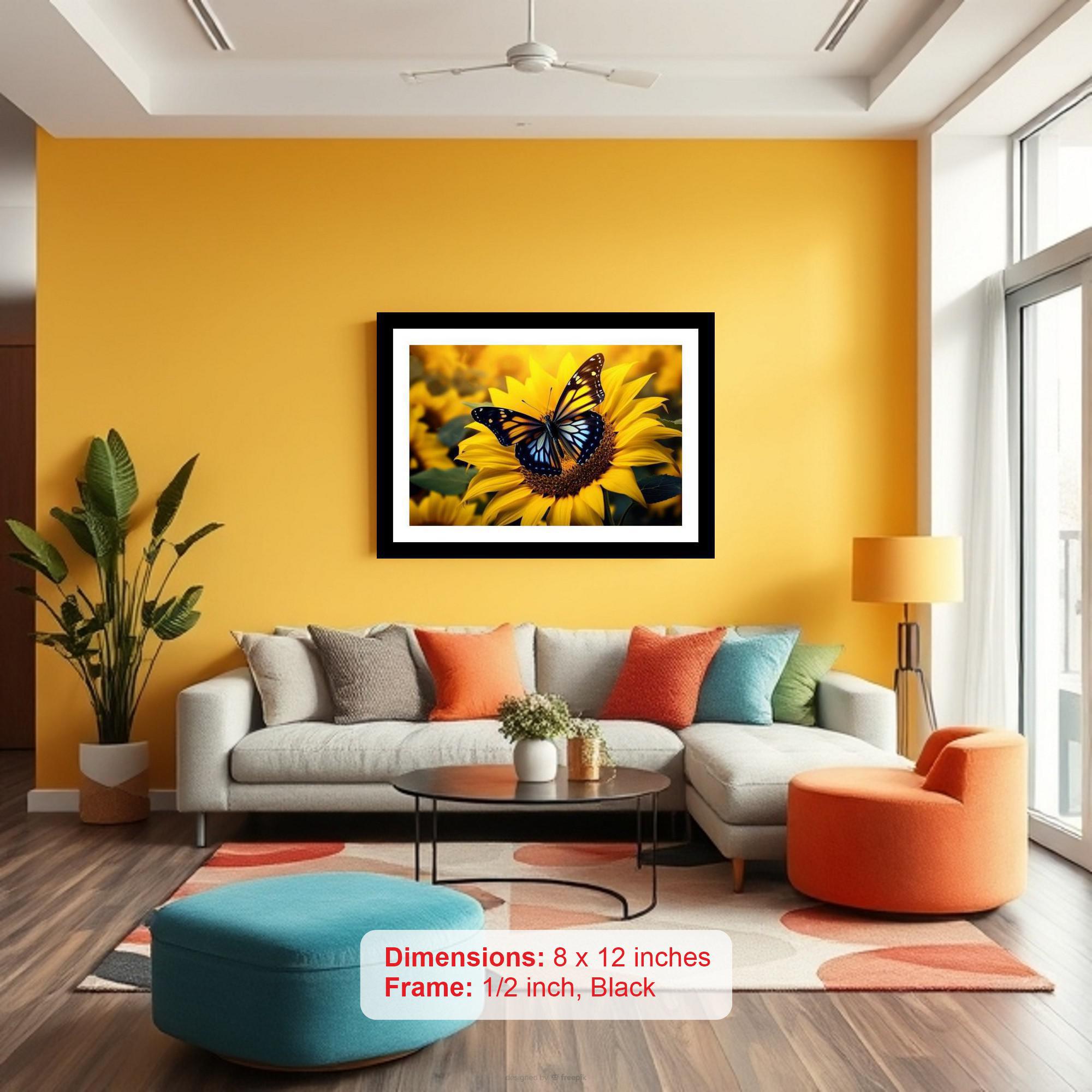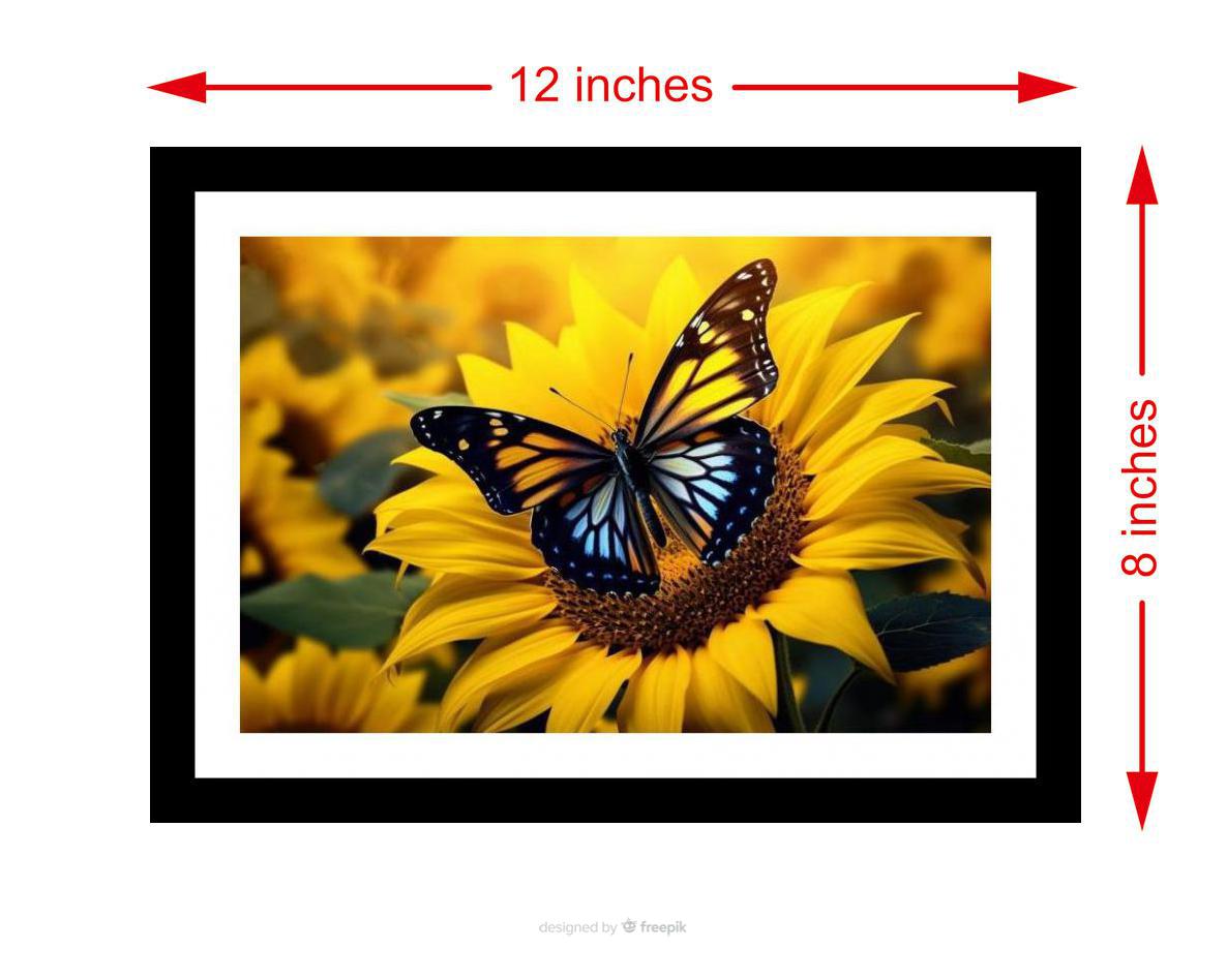Stunning shot! Butterfly on sunflower: a vibrant, beautiful moment captured perfectly. Colors vibrant, print crisp, like peering through a window to the original moment. The digital reprint boasts a striking composition, breathing new life into the beautiful photograph. Versatile Decor: Ideal for enhancing the aesthetic appeal of living rooms and bedrooms Enhanced Durability: Weather-shield laminated digital print for lasting vibrancy and protection Premium Framing: Constructed with a high-quality, durable fiber frame for long-term stability Precise Dimensions: 30 cm x 20 cm x 1 cm