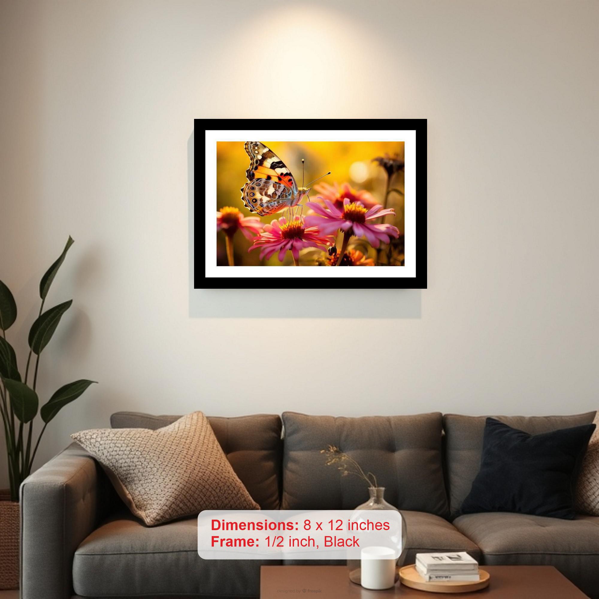 Capture timeless beauty with our classic black framed digital reprint! This elegant piece showcases a Painted Lady butterfly gracefully perched upon a vibrant pink flower, bathed in the warm glow of golden sunlight. The high-quality reprint faithfully recreates the delicate details of the original photograph, bringing nature's artistry into your home. The ornate black frame adds a touch of classic sophistication, perfectly complementing the image and enhancing its overall charm. A stunning addition to any decor, this framed print evokes a sense of tranquility and natural wonder. It's ideal for living rooms, bedrooms, offices, or hallways, adding a touch of vintage elegance to any space. This gorgeous piece also makes a thoughtful and unique gift for butterfly enthusiasts, nature lovers, or anyone who appreciates timeless art. Bring the beauty of the garden indoors with this exquisite framed print!