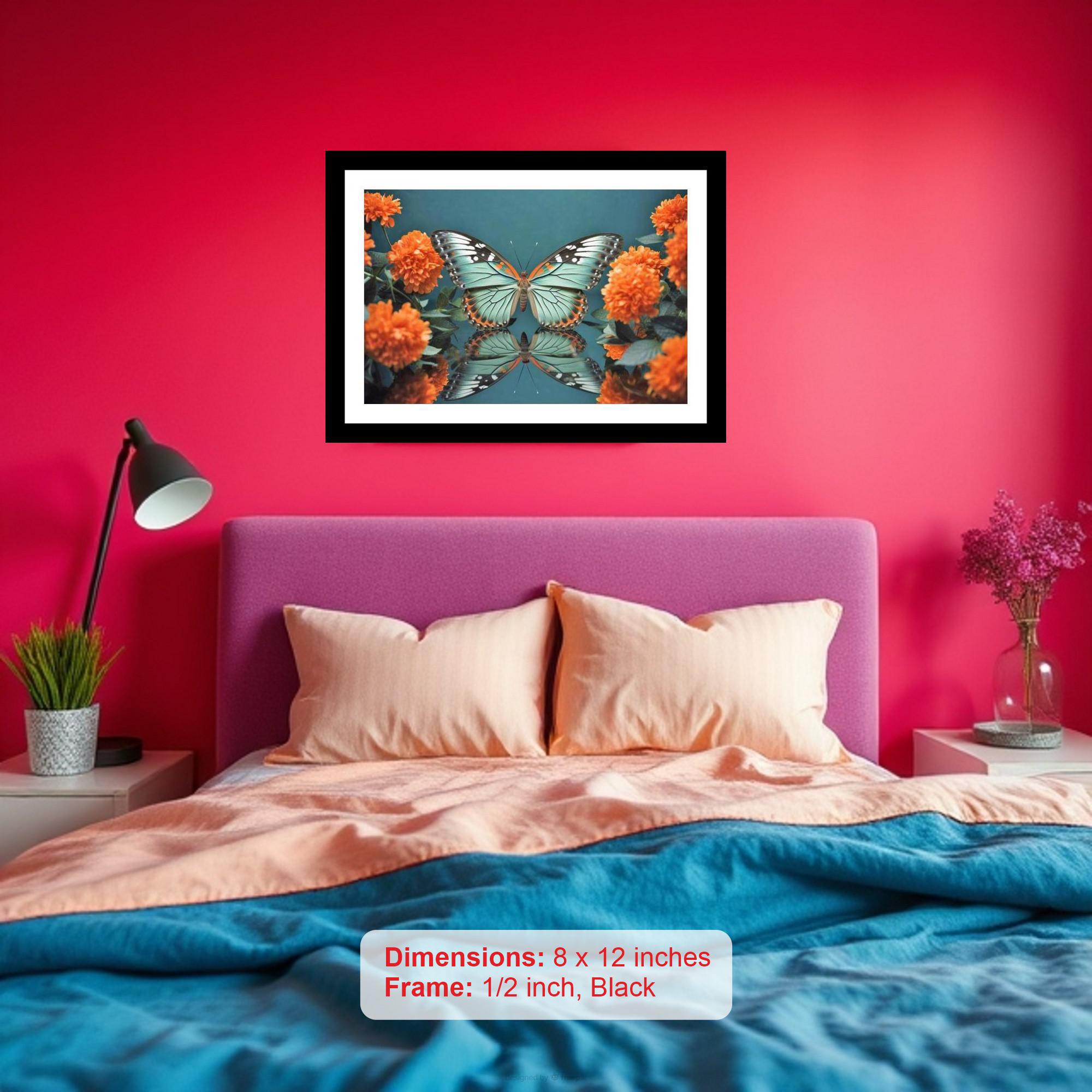 Teal Butterfly Reflection in Orange Bloom: Serene Beauty. Wall Art, Interior Accents, Framing Solutions, Residential/Commercial Decor, Premium Gifts | Size: 8 x 12 inches