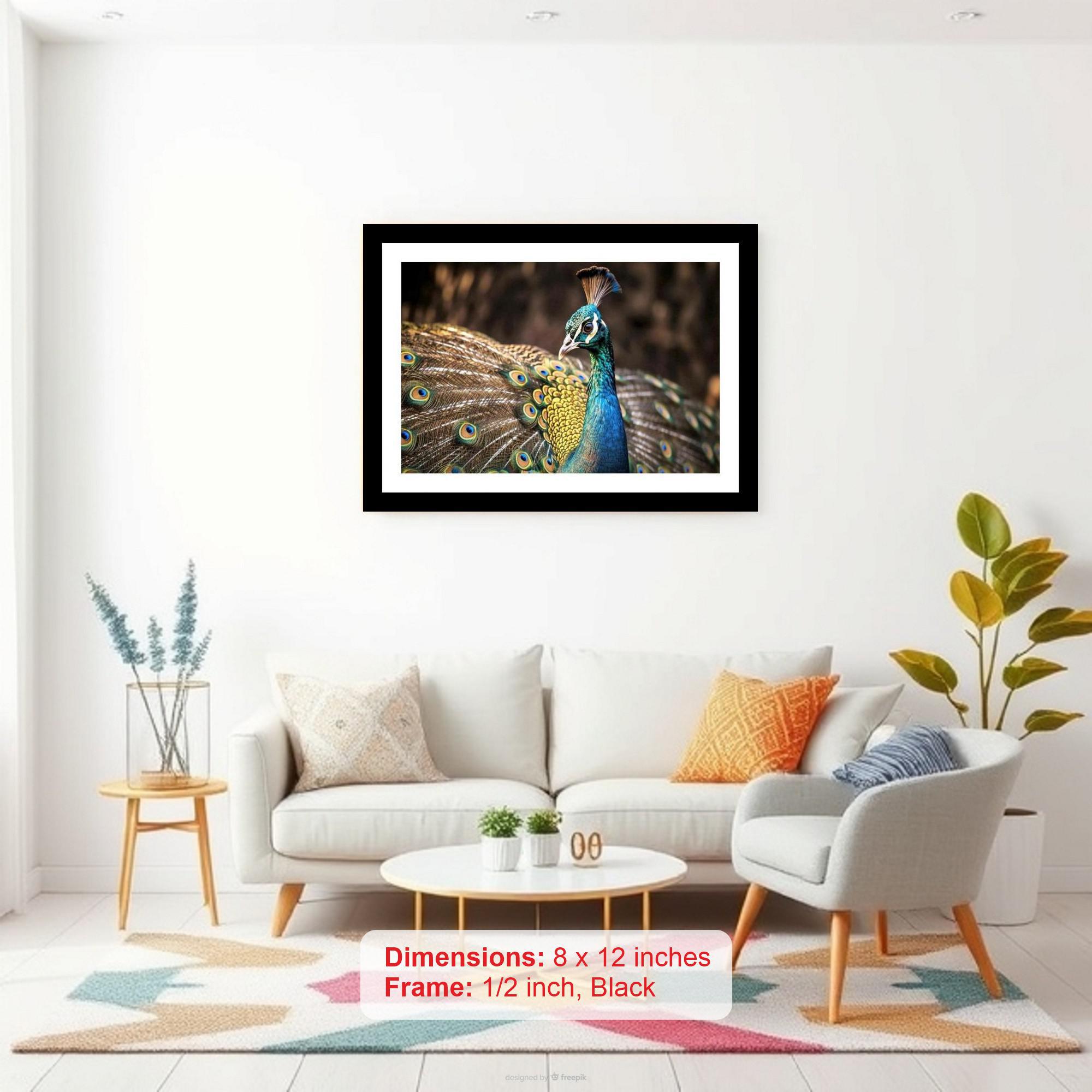 A stunning peacock photograph showcases nature's artistry with its vibrant, iridescent plumage. The vibrant colors and crisp details of this reprint truly bring the photograph to life. The digital reprint boasts a strikingly composed image, breathing new life into the original photograph's beauty. Versatile Decor: Ideal for enhancing the aesthetic appeal of living rooms and bedrooms Enhanced Durability: Weather-shield laminated digital print for lasting vibrancy and protection Premium Framing: Constructed with a high-quality, durable fiber frame for long-term stability Precise Dimensions: 30 cm x 20 cm x 1 cm