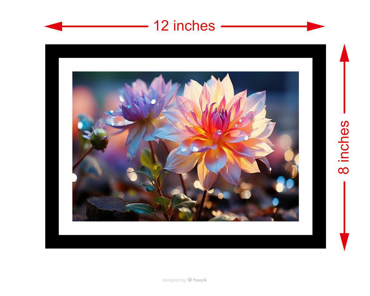 Dahlias in dewdrops, radiant in the dawn. Soft light makes these dahlias shine. Dewy dahlias, a magical morning scene. The reprint's colors pop and the print is so sharp, it's like looking through a window to the past! The reprint's striking composition breathes new life into a beloved photograph, beautifully capturing its essence. Versatile Decor: Ideal for enhancing the aesthetic appeal of living rooms and bedrooms Enhanced Durability: Weather-shield laminated digital print for lasting vibrancy and protection Premium Framing: Constructed with a high-quality, durable fiber frame for long-term stability Precise Dimensions: 30 cm x 20 cm x 1 cm